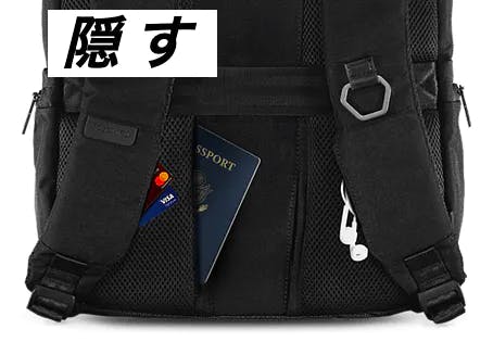 背面の隠しポケットは、優れた防犯性を持ち、パスポートや財布、鍵などの貴重品を入れるのに最適です。