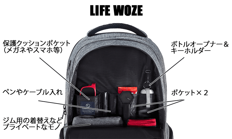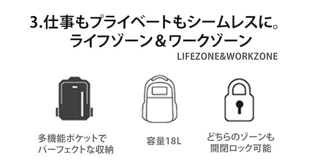 LIFEPACK2.0は、プライベートなものや着替えなどを収納するためのライフゾーンと、PCや書類など仕事に使うものを収納するワークゾーンに分かれていて、分離して整頓することができます。