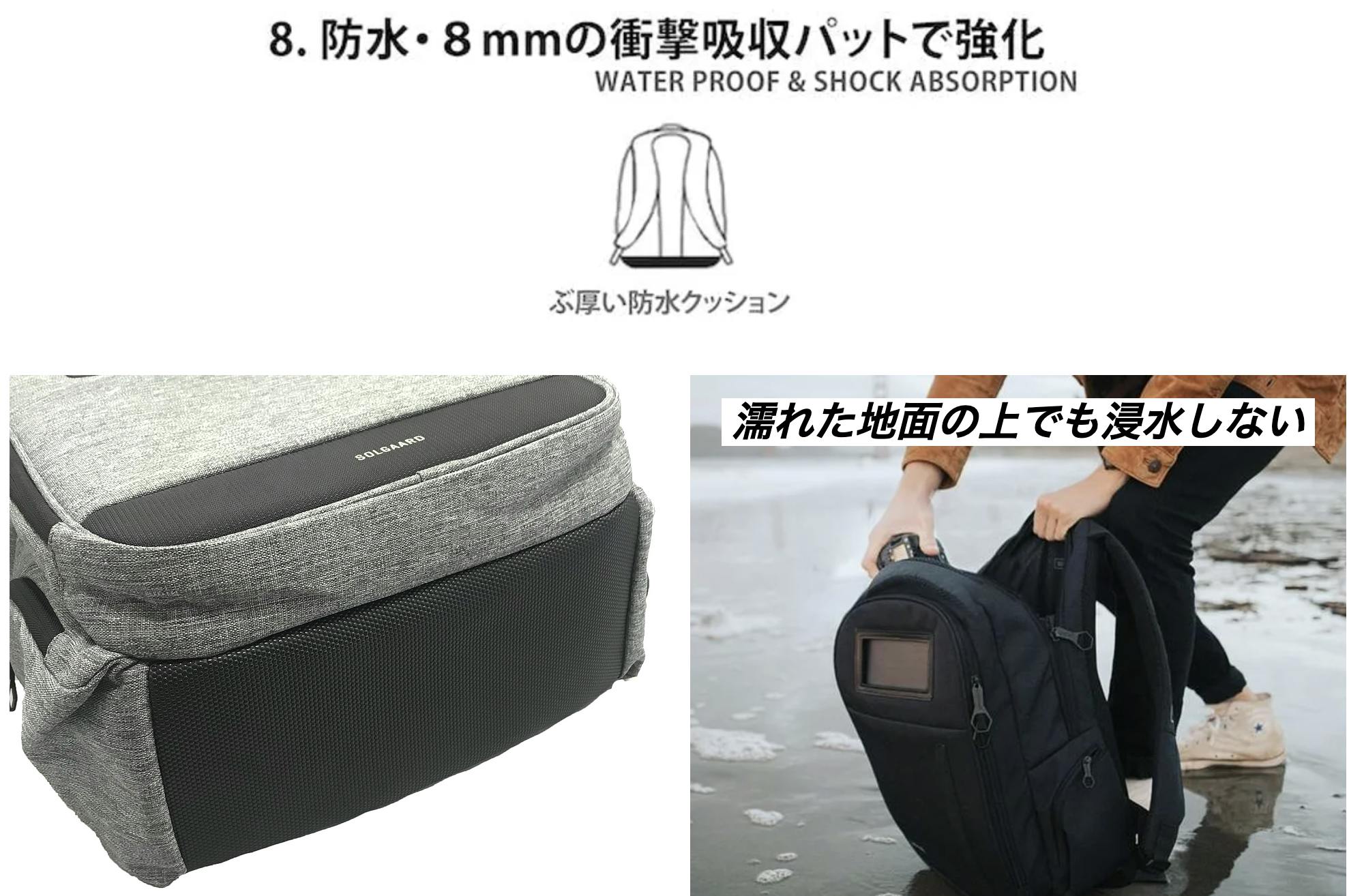 リュックの素材は4層構造になっています。水を弾き、耐刃でナイフで切っても破れません。