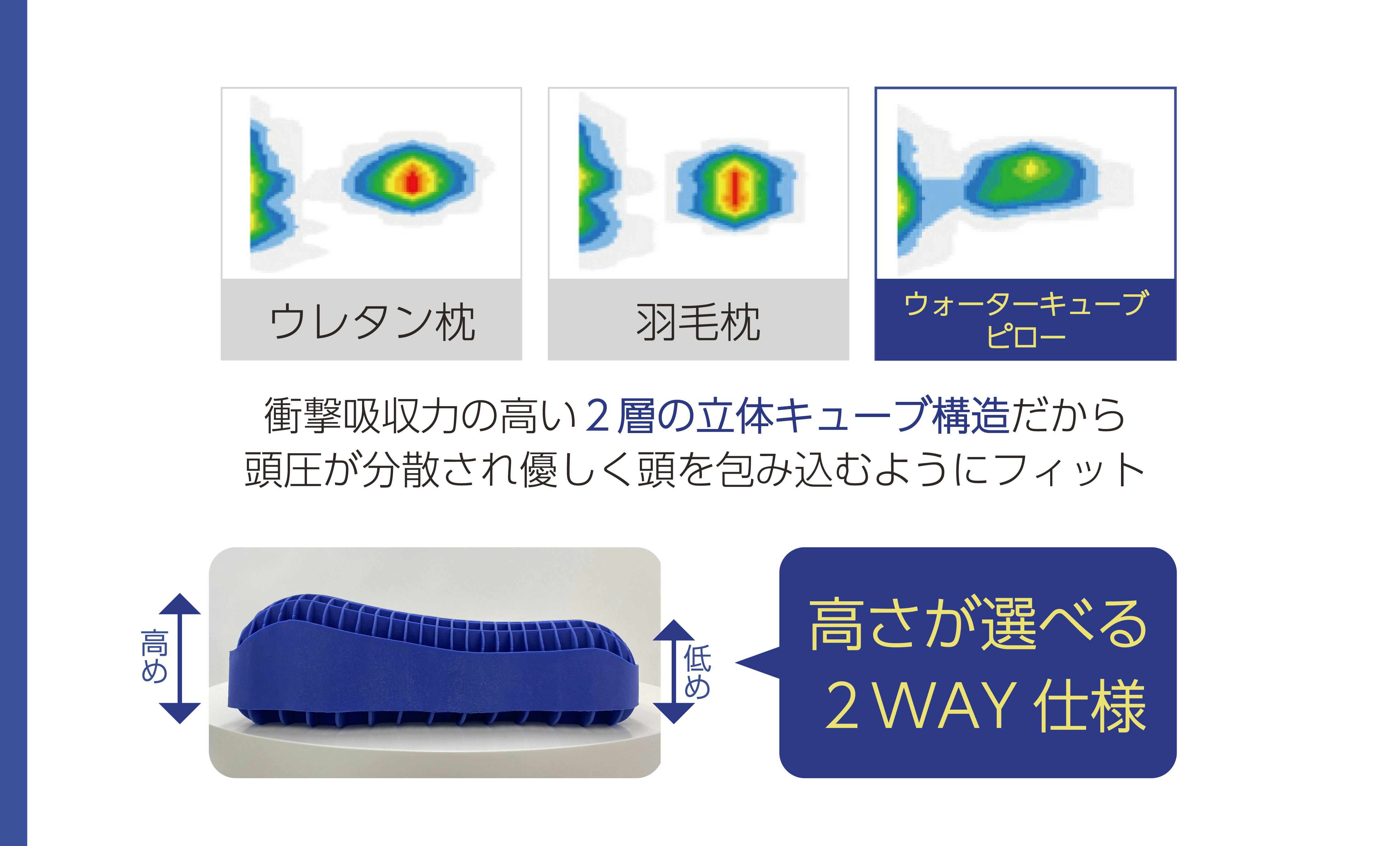 独特の柔らかさ、形状で頭へのフィット感&寝返りのしやすさを追求したWATER CUBE PILLOW。