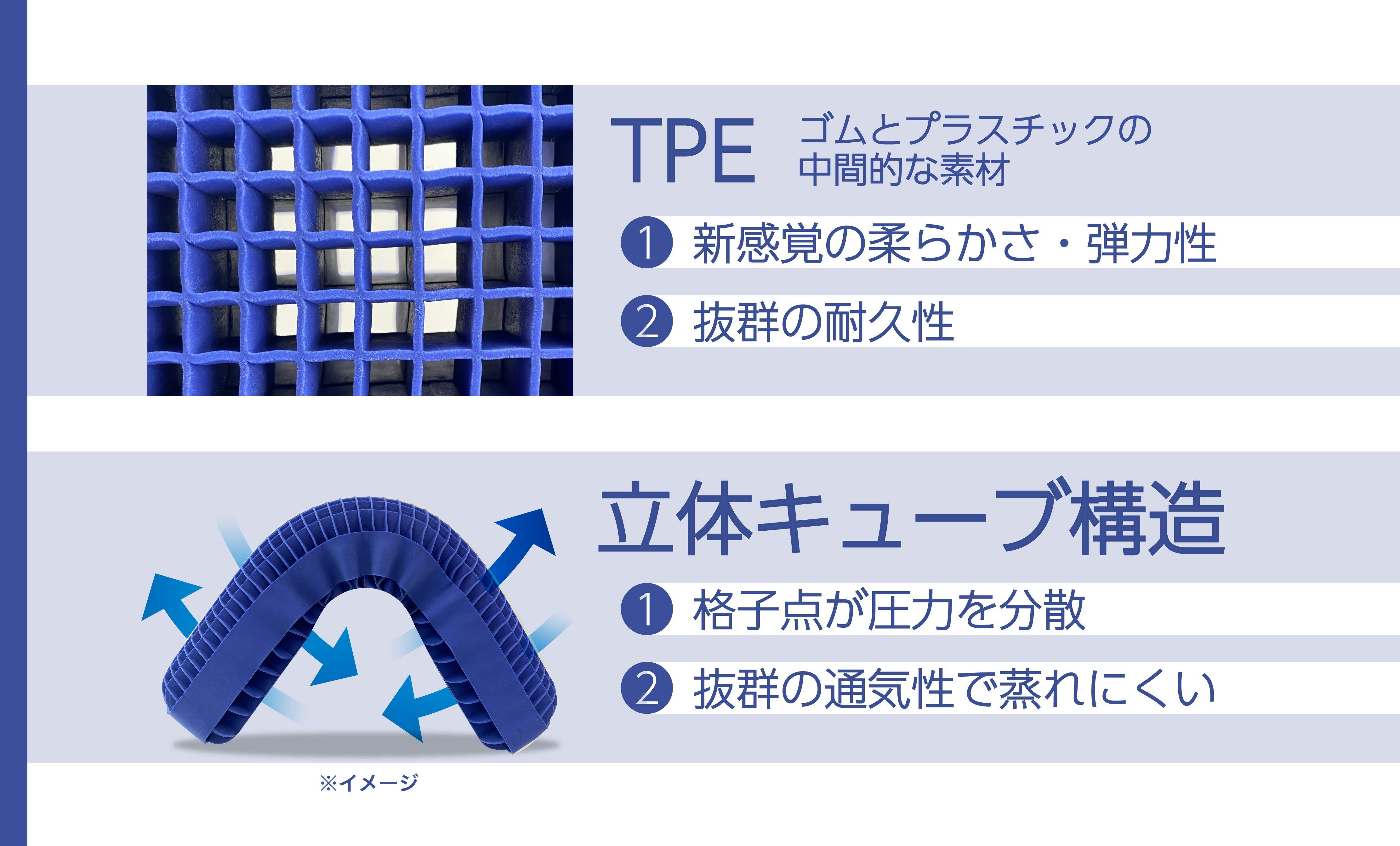 空気層の多い立体Cube構造で不快な熱気や湿気を効率よく逃がしてくれ、