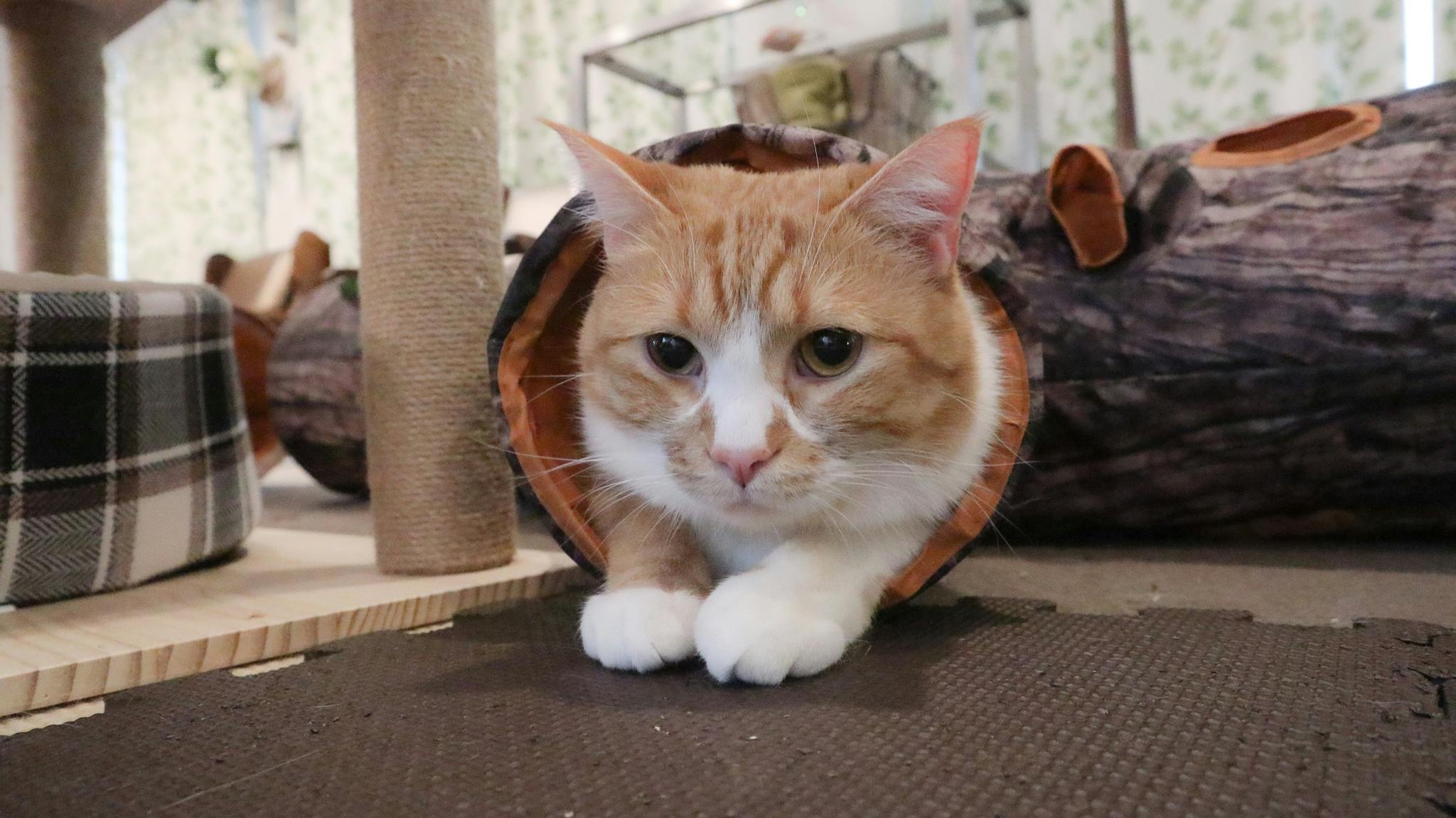 キャットタワーで基本的に生活をしています。単独が好きな物静かなタイプです。