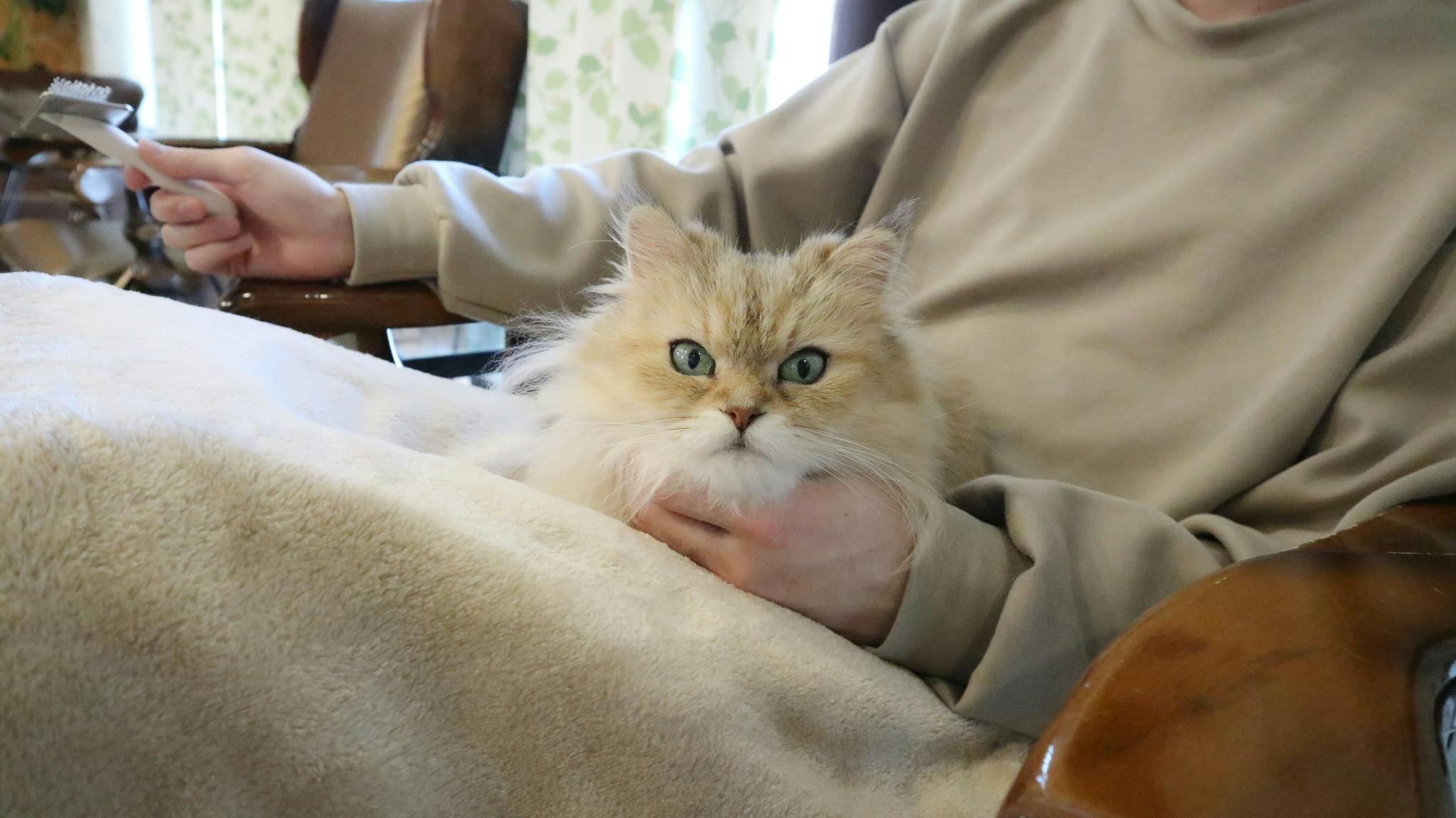 お客様のお膝が大好きでぴょんと乗ってきます。お話も大好き。