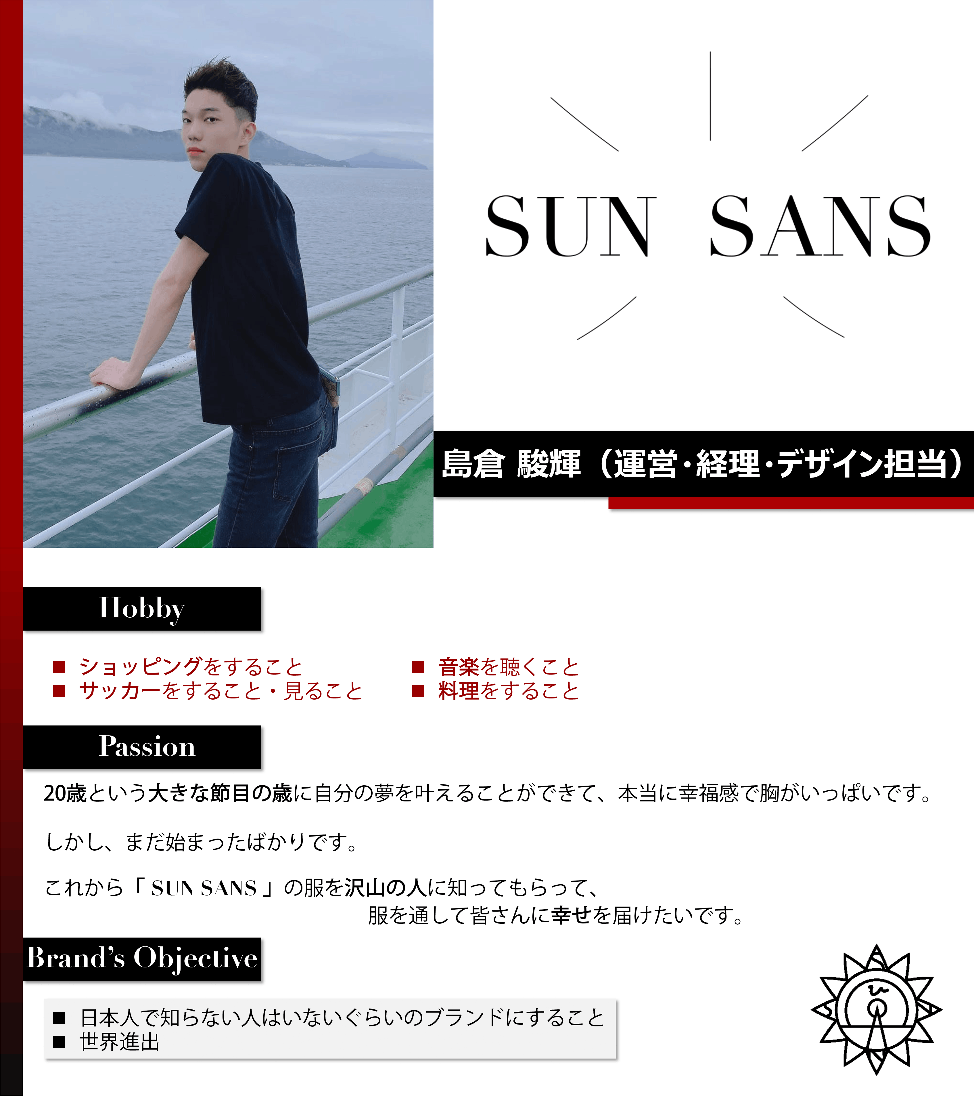 皆さんこんにちは! SUN SANS の代表を務めさせていただいております、島倉駿輝です!