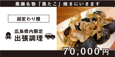 少し変わったリターンとして、以前開発に関わった地元黒瀬町の新名物の見た目が真っ黒なたこ焼き【黒瀬黒たこ焼き】を広島県限定で出張してその場で焼き上げます。熱々のたこ焼きをお楽しみください。
