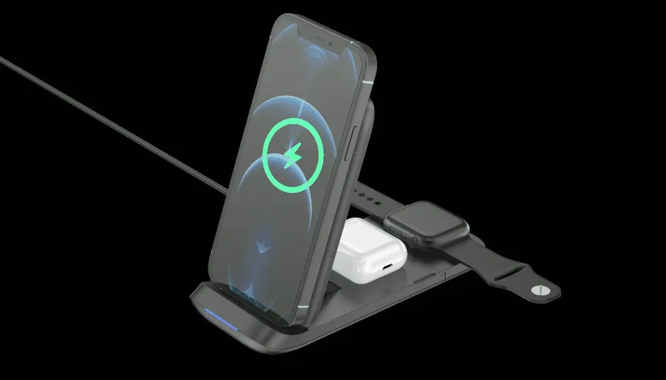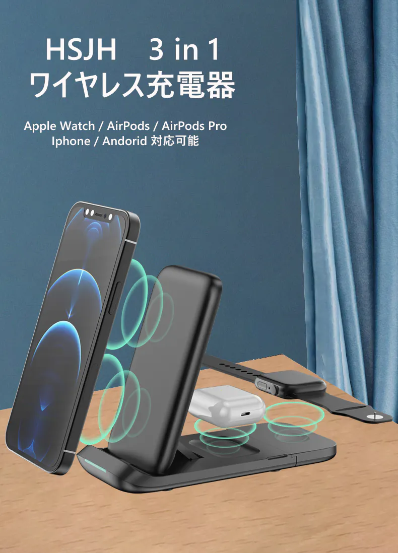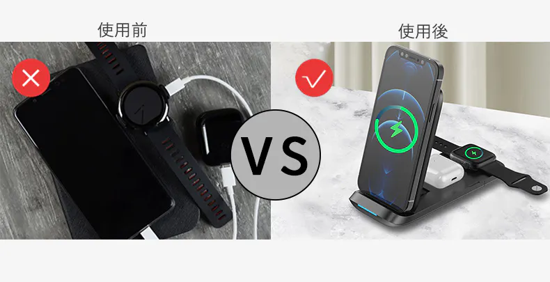 iPhone/Samsung・Apple Watch・AirPodsなど、たった1台の充電器で複数のデバイスを同時に無線充電できます。