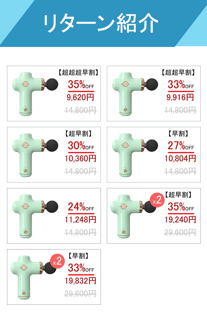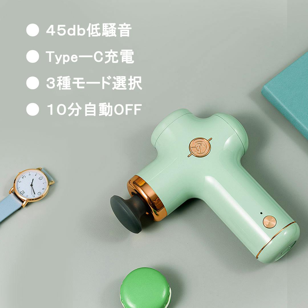 ハイエンドのブラシレスモーターが搭載され、他モーターと比べて効率が80%以上となっています。低ノイズ (45dB) を実現して、周りの方へご迷惑をかけません。3000回/分の強力かつ正確な振動が提供でき、トレーニング、運動前のウォーミングアップ、運動後のクールダウン、日常のリフレッシュに大活躍です。アスリートやスポーツ愛好者だけでなく、デスクワークや立ち仕事の多い方に特におすすめです。