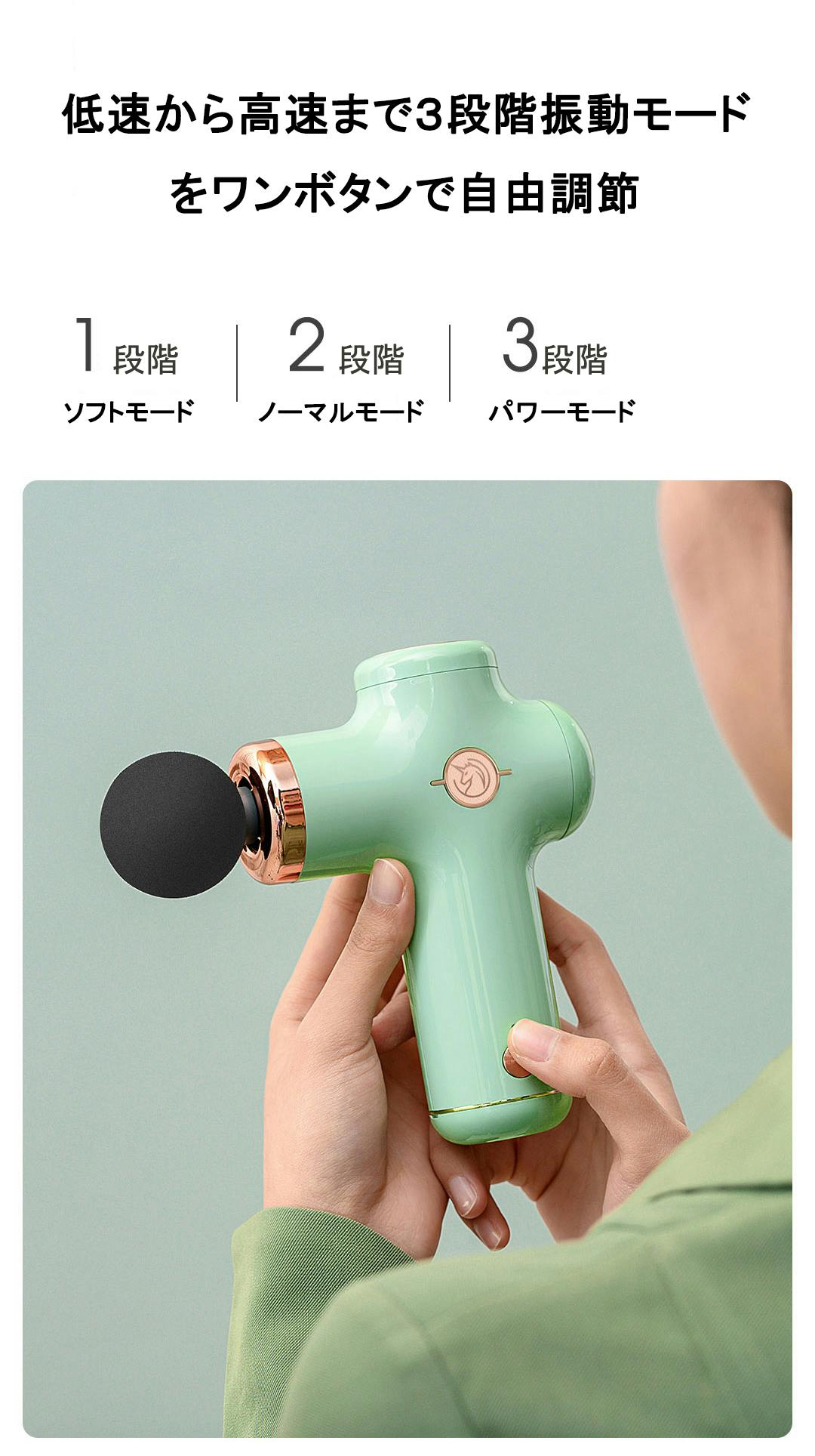 1分間に最大3000ストロークを繰り出し、モードを変更できます。3段階の中から、体の状態にあった振動強度レベルを選ぶことができます。初心者の方から使い慣れたプロの方まで満足の行く3段階の強さになっており、日常の疲れを癒すことからエクササイズによる負荷のリカバリーまで、様々な用途に使用することができます。