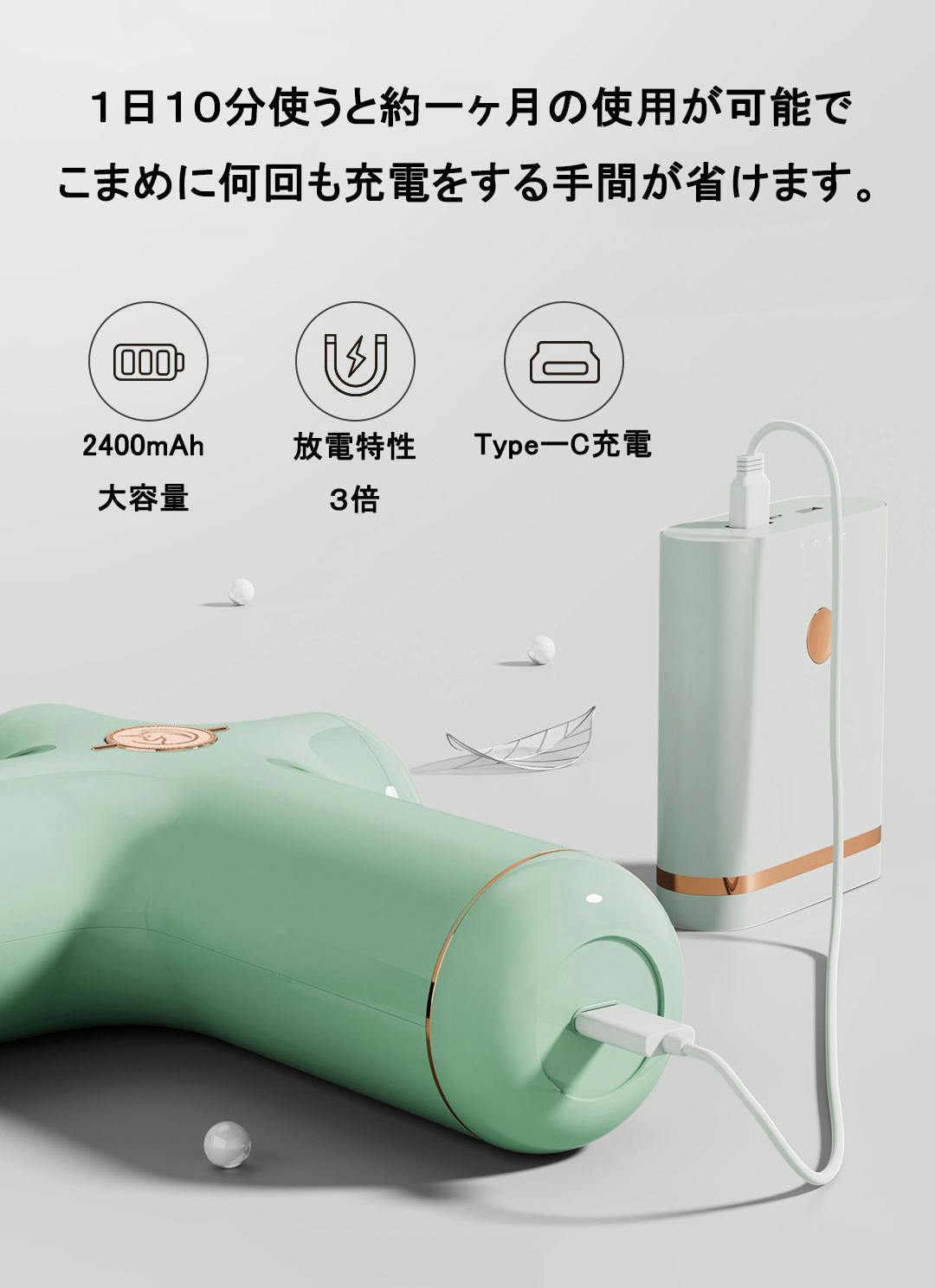 持ち歩いて使うからこそ、1回の充電でずっと使えるように、長時間の使用が可能なバッテリーを採用しました。2,400mAhのリチウムバッテリーを内蔵し、1回のフル充電で毎日10分ぐらい使うと、最長一か月間稼働します。電池残量を心配せずに、使えるのは嬉しいですね。
