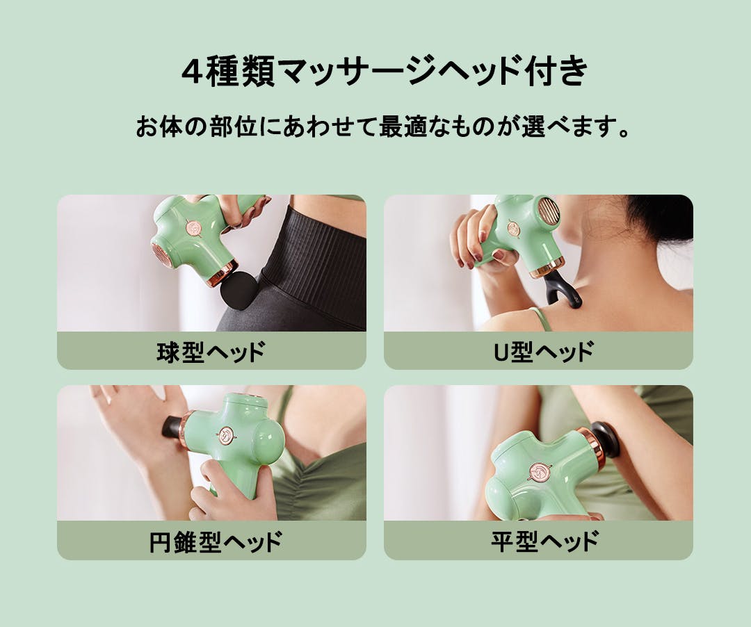 Monicaには、ニーズに合わせた4種類のヘッドがあります。各ヘッドは、体全体にアプローチできるよう、ヘッドによって圧力の機能の異なるタイプを特別に設計しています。首、背中、腰、お尻や足など様々な部位の筋膜をケアできます。