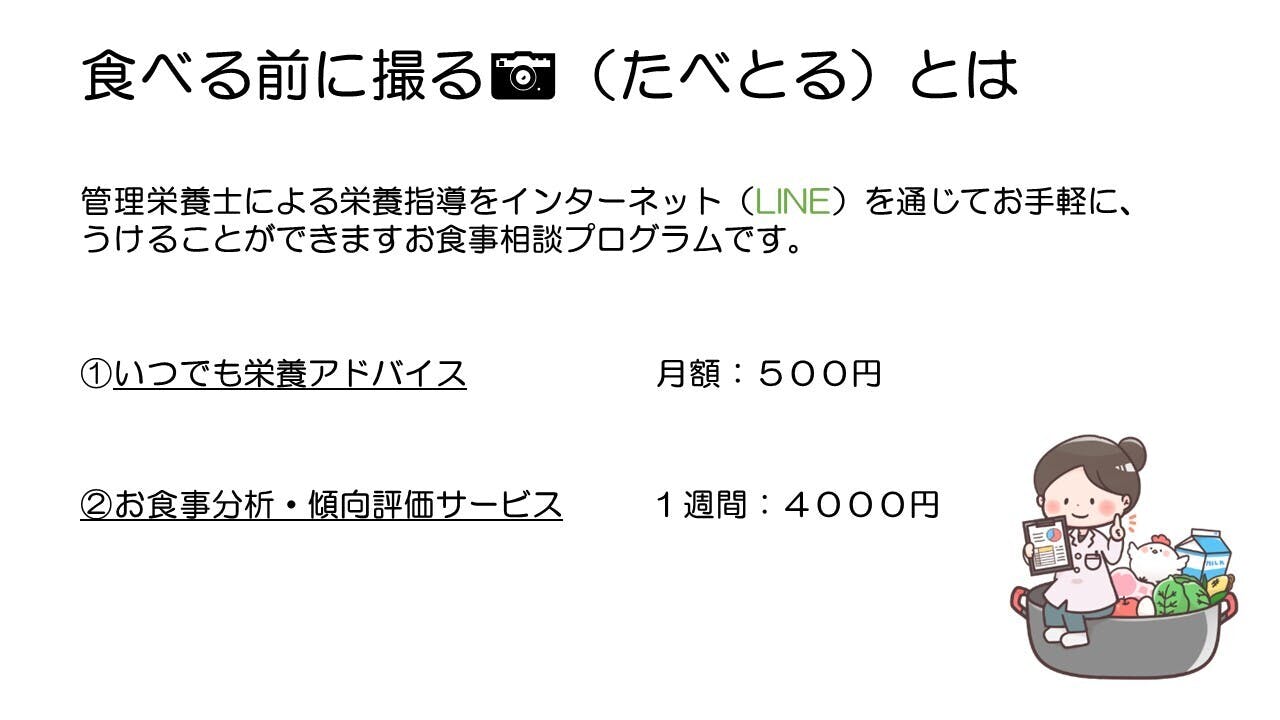 弊社の新サービス「お食事相談プログラム 食べる前に撮る(たべとる)」利用していただき、食事相談管理栄養士による栄養指導をインターネットを通じてよりお手軽に、より多くの方にぜひ受けていただきたいです。