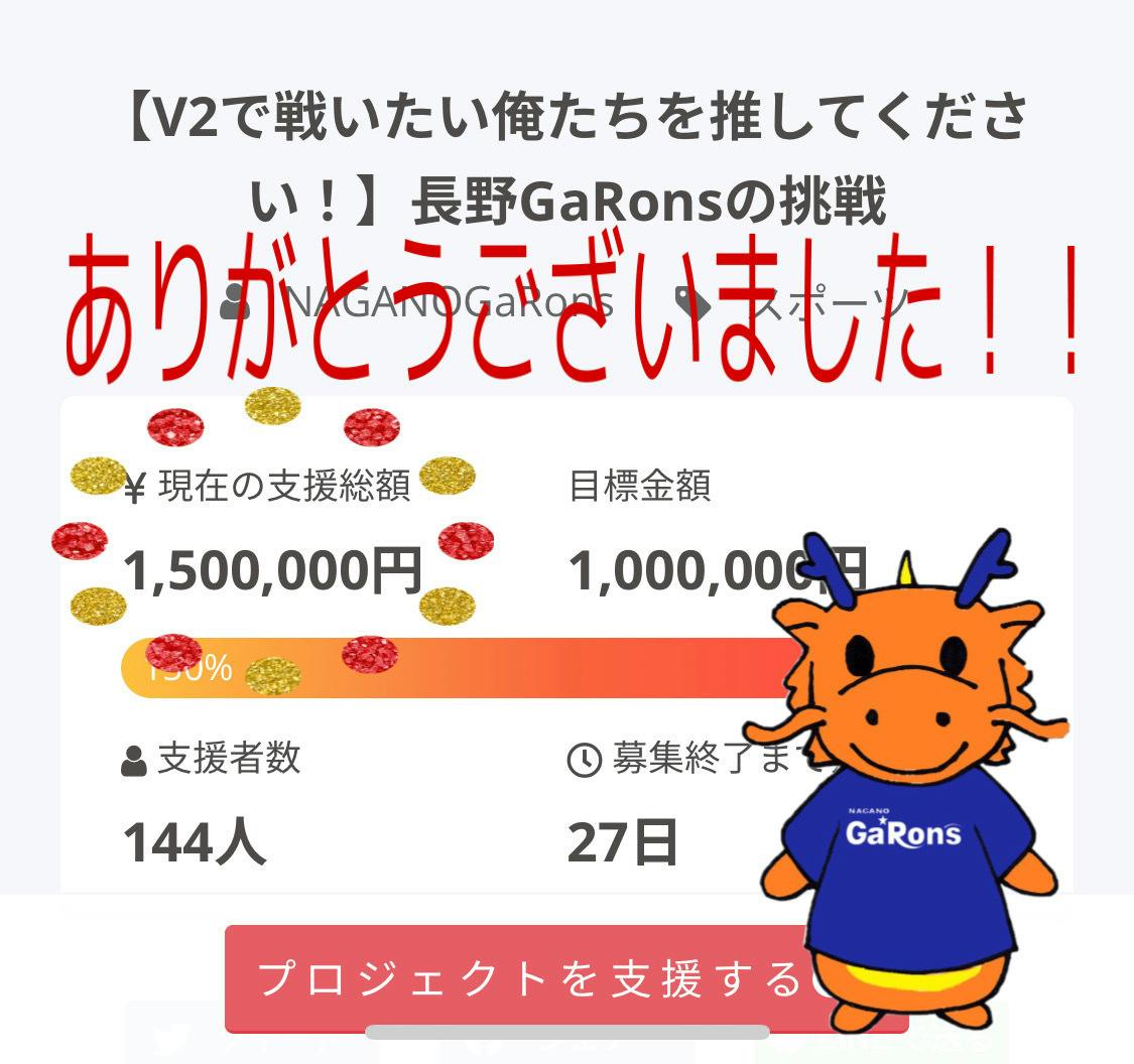 2021/07/21 10:00長野ガロンズ事務局です。この度、【V2で戦いたい俺たちを推してください!】長野ガロンズの挑戦は、無事にプロジェクト終了することができました。はじめての挑戦でしたが、最終的に1929.000円もの金額となりました。これはすべて、ガロンズを応援してくださっているお一人お一人のみなさまのお力のおかげと、本当に感謝の気持ちでいっぱいです。ご支援だけでなく、 SNSで盛り上げてくださったり、話題にしてくださったり、本当にたくさんの方のご協力をいただきました。すべてのみなさまに、心より感謝申し上げます。これからリターン品を準備してまいります。8月より随時、果物は時期になりましたら発送いたしますので、しばしお待ちいただけますと幸いです。今後とも長野ガロンズをどうぞよろしくお願いいたします!!本当にありがとうございました!! もっと見る