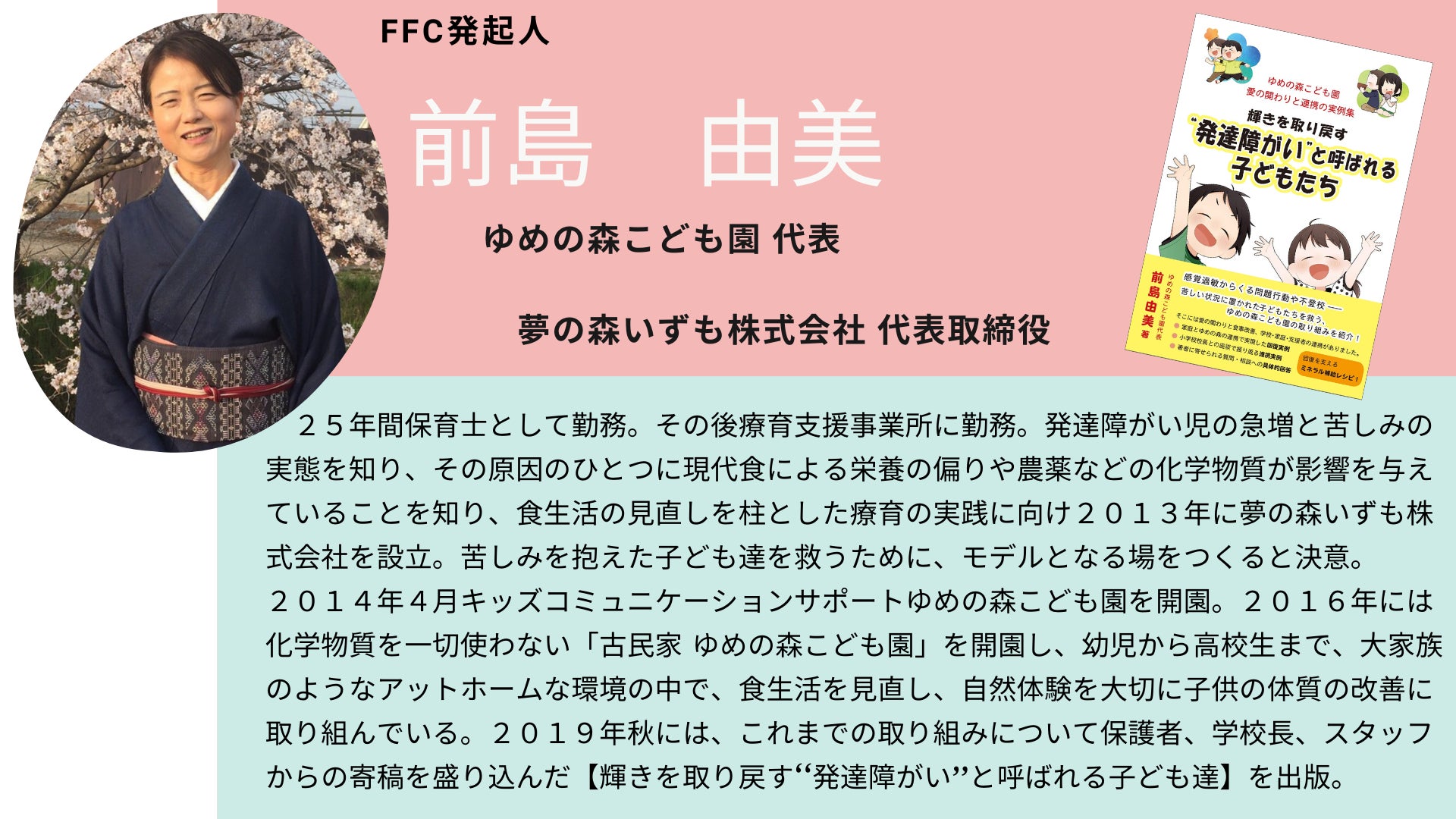 FFCは、出雲で「ゆめの森こども園」を運営されている発起人の前島由美さんが、「発達障がい」と呼ばれる子どもたち・家族と日々関わる中で、ミネラル豊富な「食」を見直す取り組みをスタートし薬を使わずに食や愛あるかかわりで改善していく子どもたちを目の当たりにしたことがきっかけで、子どもたちへ「安心・安全な給食の提供」の実現に向けて立ち上がっています。