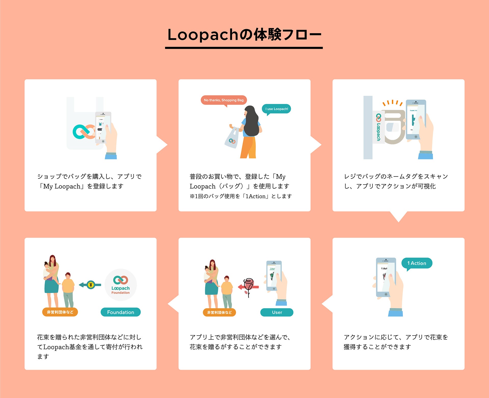 ユーザーはアプリを保有して「My Loopach」を管理し、レジ袋を断るという日常のアクションを可視化します。日々のアクションによってポイントが加算され、溜まったポイントを市民活動団体に寄付が可能です。