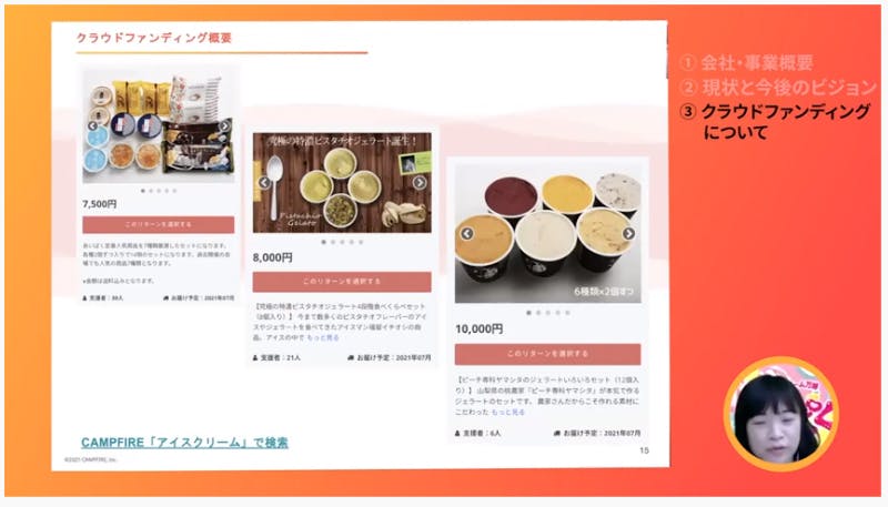 2021/06/02 19:46CAMPFIREアカデミーは、クラウドファンディングのノウハウを、無料で学べるサービスで、クラウドファンディングに興味はあるけどはじめの一歩がなかなか踏み出せない方や、実際の事例からどんなことを実施しているのかなどセミナーを通して学べます。今回は、お声がけ頂き登壇させて頂きました! あいぱく開催に至るまでの経緯や日本アイスマニア協会を立ち上げた目的などを発表。改めて自分たちの活動内容を発表させて頂きましたが、あいぱくをはじめて5年がたち、いろんない会場で開催させて頂いていたことが本当に懐かしく感じました(笑)早くイベント再開したい!そして、新型コロナウイルスによる影響も発表。現状、イベントは開催できる状況ではありませんが、すこしでも地方のアイスメーカーさんの力になれるような活動をしていきたいですね。最後に、今回立ち上げたプロジェクトのリターンの説明。動画での視聴はこちらから⇒ https://youtu.be/VAqNuHOaZdw 弊社以外にも2社が登壇されていて、自社の商品を知ってもらう方法としてクラウドファンディングを活用していたりと、活動的に動かれていることに感動しました。少しでも今を取り巻く環境が良くなることを願いつつ、これからも美味しいご当地アイスをアイス好きの皆さんに発信していきたいと思います!今回立ち上げたプロジェクトは、残り11日ですが、引き続き、ご支援よろしくお願い致します!! もっと見る
