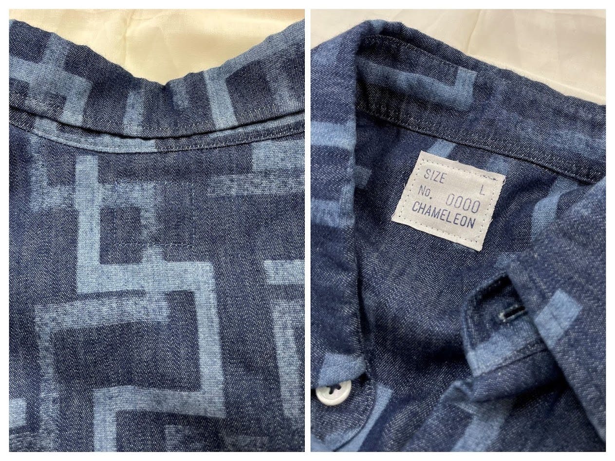 今回作ったデニムシャツは市場に流通しているプリント生地ではなく、カメレオンオリジナル柄を抜染加工した生地を使用しており、他には無い希少価値の高いものとなっています。