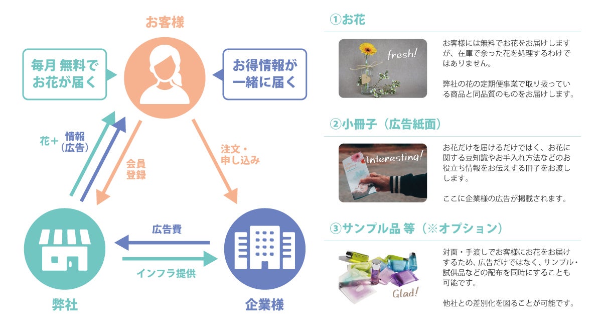 折込広告・WEB広告で花の定期無料会員を募集しながら、広告掲載を希望する企業の募集を開始。