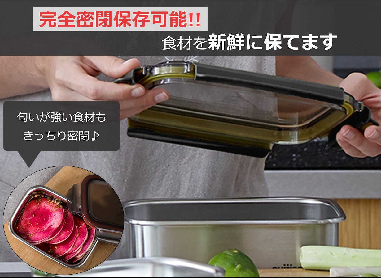 ④密閉保存できるので、食材を新鮮に保てます。匂いの気になる食材も安心して保存できます。