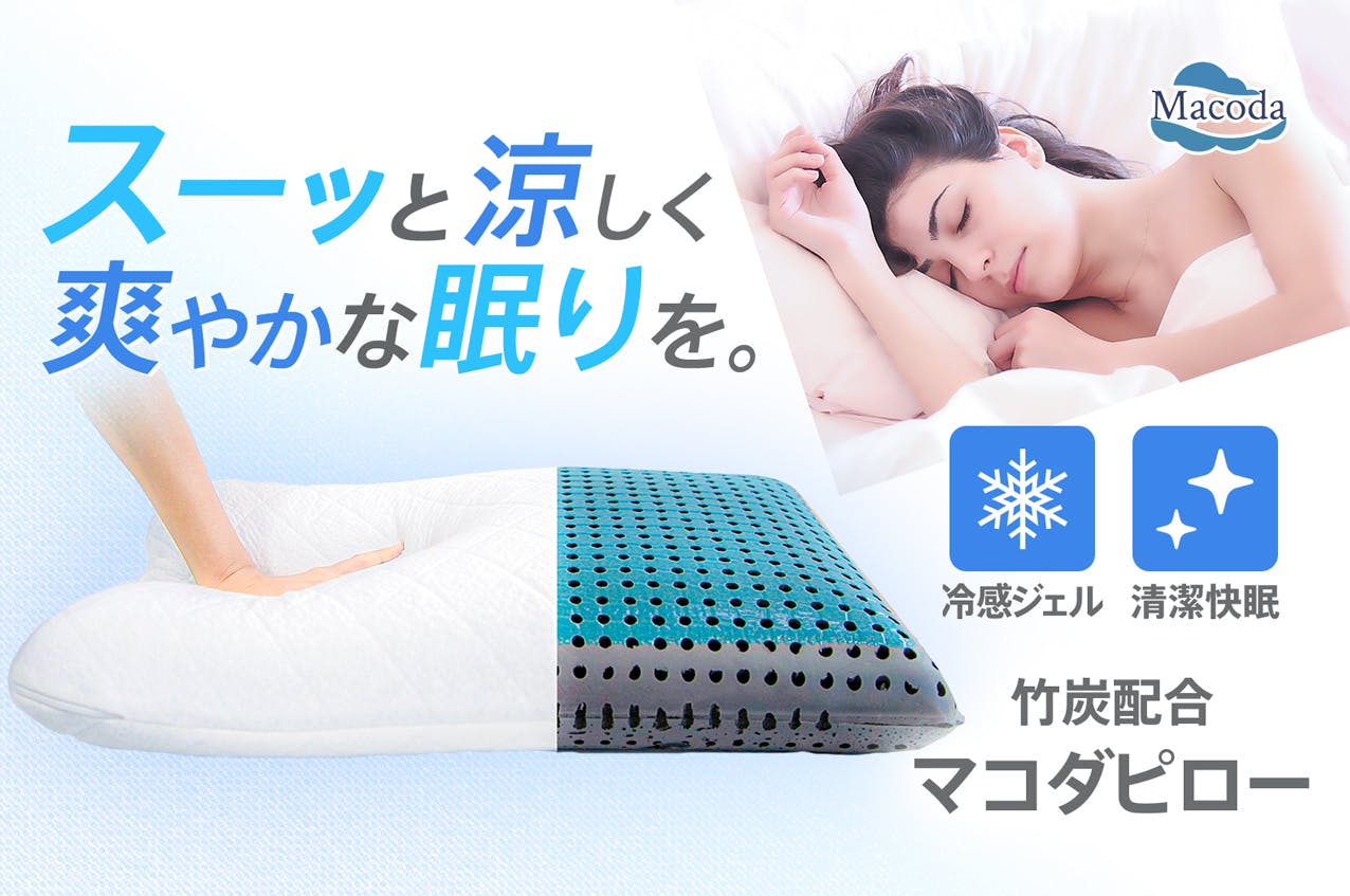 マコダピローは形状記憶ウレタンフォームや冷却ジェル、天然素材の竹を採用し、入眠や睡眠時に起こる様々な問題を機能的に解決。