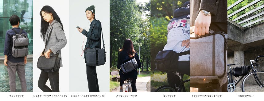 「Project Nine 7 way bag 」は、車体に装着するフレームバッグ、身に着けるメッセンジャーバッグとリュックサック、ヒップサックとしても利用することができます。