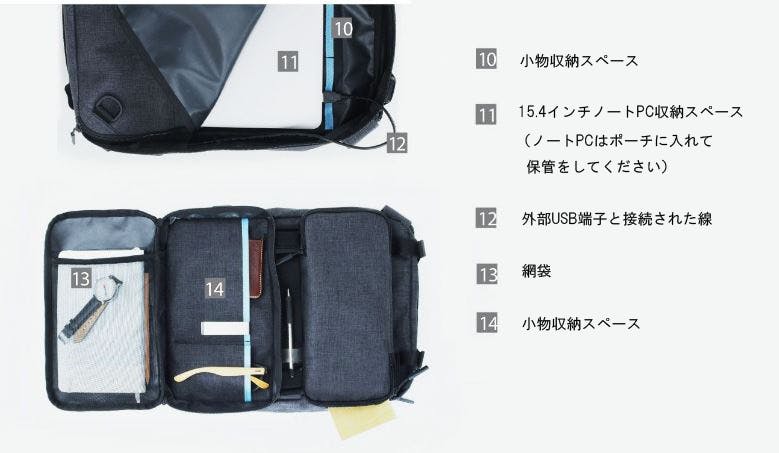 A5:リュックの内部からUSBケーブルが出ております。そのケーブルとモバイルバッテリーを接続頂きますと、充電が可能な状態になります。モバイルバッテリー接続後、外部のUSBポートと普段使用されているUSBケーブルを接続し充電を行います。