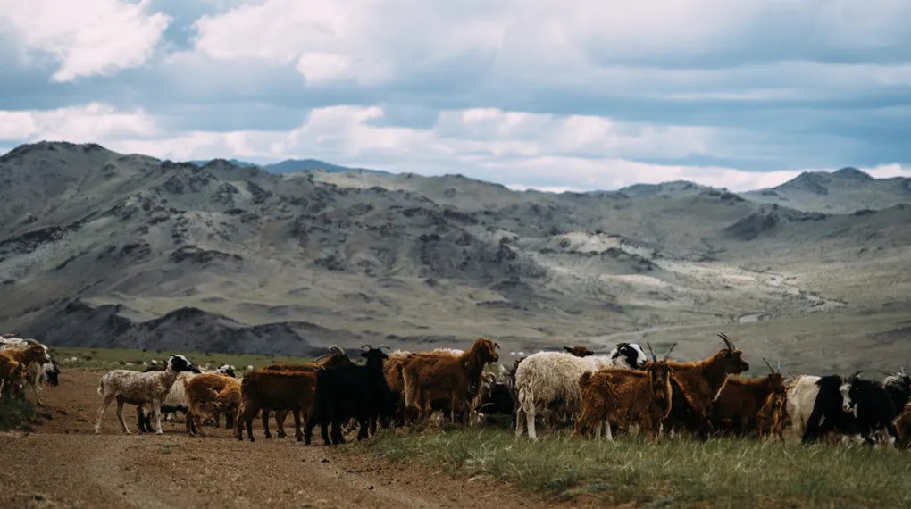 原料は、モンゴルの首都ウランバートル市から約650km離れたバヤンホンゴルの遊牧民の方から分けていただいた、希少なヤクの毛です。繊維を傷つけないように一頭ずつブラッシングして毛を採取し、糸が作られています。