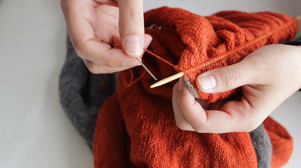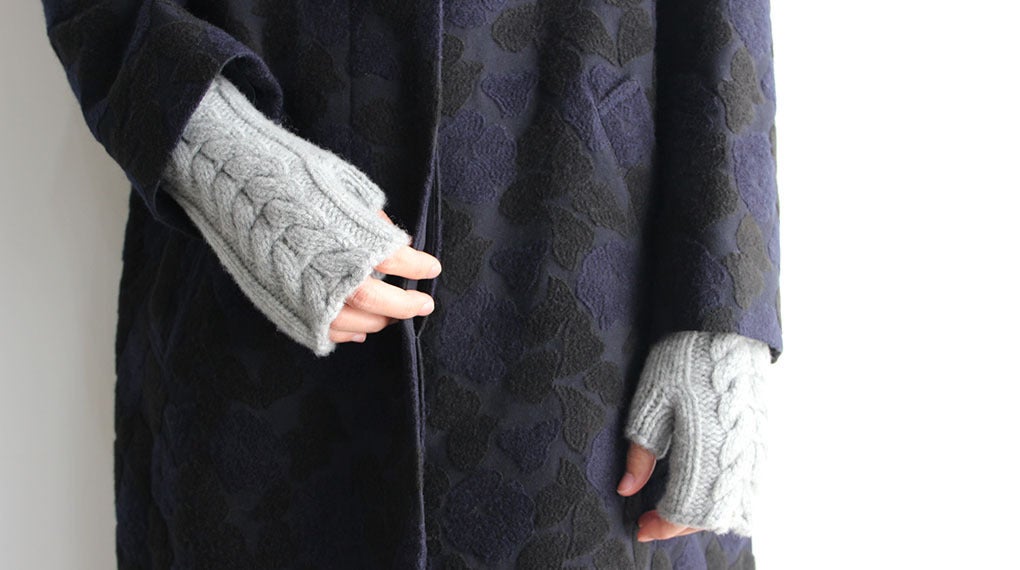 こちらのアームウォーマー・スヌード・ニット帽子に編み込まれているケーブル模様を「手編み機」で編み上げるためには、非常に高い技術が必要です。「ライク」さんと一緒に、「どのような作業ならお願いすることが可能か?」というところから一緒に考えながら、作り上げました。