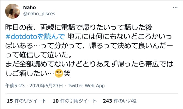 2021/12/29 17:58皆さん、突然のキュートでちょっぴりダークな4コマ漫画で面食らわせてしまいごめんなさい!こんにちは!ドット道東・ビジョンブック制作支援チームです!突然ですが、たくさんの方からご支援いただいた『1000人の道東の理想を載せた、ビジョンブック出版プロジェクト』のSNS企画がスタートしています!今回の企画は「自分の地元を人に例えると?」です。簡単に言うと、釧路は「めちゃひどいことをされたけど結局忘れられない元彼」遠軽は「お祭り・イベントが好きで、音楽に詳しいフリをしているミーハーな友人」 十勝は「学生時代は地味で目立たなかったけど、社会人になったら地頭の良さを活かして活躍しているクラスメート」のような感じで、「みんなの地元を人に例えてみよう!」という大喜利的な企画です。元恋人に例えても良し、親に例えても良し、幼馴染に例えても良し。自慢を交えても良し、愛のあるいじりを交えても良し。皆さんの地元が、どんな風に擬人化されるのか、とっても楽しみにしております!(個人的にはクスッとできるような、愛のあるいじりも楽しみです)ぜひ冒頭の4コマ漫画を思い浮かべながら、皆さんと地元の間だけの関係性を言葉にしてみてくださいね!以下、「自分の地元を人に例えると?」企画について、企画の経緯と詳細をまとめたので、ぜひ一度目を通してみてください。▼企画の経緯、ドット道東の想い実はこの遊び、ドット道東では前からやっていたんです。▲ドット道東理事・名塚ちひろが、自分と地元・釧路との関係性を表すとこうなりますこの遊びをぜひ皆さんと共有したいなと考えて、この企画を始めることにしました。年の瀬を迎えて、ふと自分の暮らす町や故郷を振り返ることがあると思います。そのふとした自分の暮らす町や故郷への思いを自分の中で留めるだけじゃなく、自分や友人の住む町を話題に会話が弾んだら、なんて素敵なんだろうと考えました。同じ町を表現しても人によって全く異なるし、「そんな風に見えてる人も居るのか〜!!」とか「その例えめっちゃ分かる〜!!あるある〜!!」とか。友人の住む町を聞いてみると、「あ!!私の地元と似ているかも!?」とか「何その例え!!めっちゃ気になる!!行ってみたい!!」とか。人ぞれぞれ違った見え方があり、自分の地元や住んでる町に対して自由に表現してもらって、共感を呼んだり、見つめ直す機会になると良いなぁと考えています。友人や家族と雑談の中で、お互いの地元について話してもらうきっかけに、ぜひハッシュタグ『#私の地元はこんなやつ 』を付けて投稿してみてください〜!みんなで地元を例えて遊びましょう!▼「#私の地元はこんなやつ」の遊び方についてSNSにて「#私の地元はこんなやつ」のハッシュタグとともに投稿していただいたものは、現在制作中のビジョンブックに掲載する候補とさせていただきます!皆さんからの投稿、ワクワクしながらお待ちしております。以下、企画詳細です。対象投稿:「#私の地元はこんなやつ」タグがついた投稿テキストは勿論のこと、イラストや動画などでの表現も大歓迎です!お願い:擬人化した「地域名」の記載をお願い致します。対象SNS:Twitter、Instagram(ストーリー、フィード投稿)対象期間: 2021年12月16日(木)20:00〜2022年1月16日(日)23:59お1人様につき、何投稿でもしてください!掲載に関するお願いについて:掲載させていただくテキスト・写真については、後日、DMもしくはリプライ等、ご連絡のつく方法でご相談させていただきます。掲載イメージ:現時点で確定していませんが、アカウント名を記載させていただく予定ではおります。その他、コメントなども頂く可能性があります。詳細は、掲載依頼をさせていただく際にお伝えします。投稿のイメージ:▲制作支援メンバー・るかさんの「#私の地元はこんなやつ」投稿。十勝の皆さん、いかがですか!?※皆さんから集まった投稿はなんらかの形で、『1000人の道東の理想を載せた、ビジョンブック出版プロジェクト』の特集企画として掲載される予定です。その際、すべての投稿を掲載できない可能性がありますこと、ご了承ください。▼『1000人の道東の理想を載せたビジョンブック』に #私の地元はこんなやつ の投稿を掲載重ねてのお知らせですが、「#私の地元はこんなやつ」のタグをつけて投稿いただいたものは、内容を厳選し、ドット道東で制作している『1000人の道東の理想を載せたビジョンブック』に掲載する予定です。投稿していただいた素敵な投稿を集めて、クスッと笑えたり、「分かる〜!」と共感したり、「そんな一面もあるのか!」と、新たな気付きを感じられるような、「道東って面白いところだなぁ!」と思えるようなページを作り上げたいと思います。この「#私の地元はこんなやつ」 企画を道東から発信し、北海道そして日本全国の人たちが、「自分の地元ってどんな特徴があるんだろう?」「これって地元の魅力なのかも?」と考えるきっかけになったらいいなと思ってい