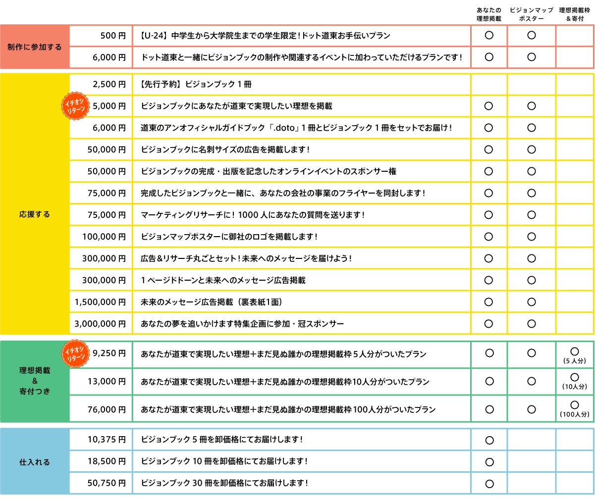 今回のプロジェクトでは、ガイドブック発行後に繋がってきた人たちと一緒に道東で実現したい理想を持つ人を巻き込むため、リターンには完成したビジョンブックと自身の理想掲載権の他に「理想掲載枠」というものを設けました。