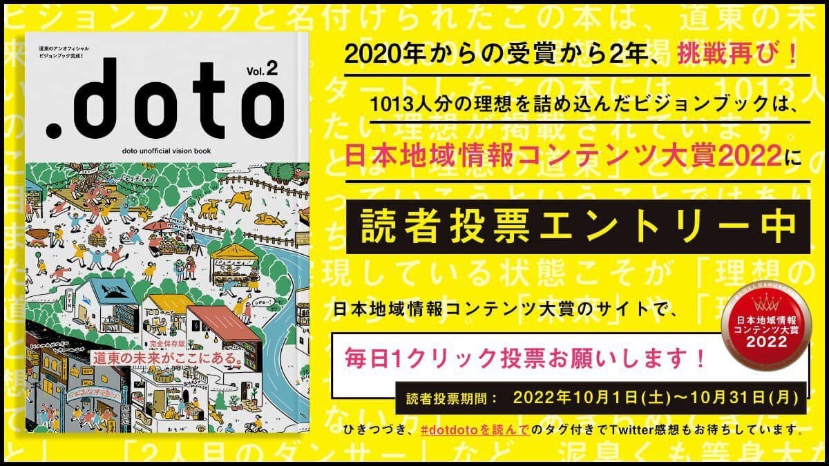 2022/10/02 08:30みなさまこんにちは!一般社団法人ドット道東です。今回は、「日本地域情報コンテンツ大賞2022」今年もみなさんと一緒に受賞を喜びたい…!!読者投票をぜひお願いします!!というお知らせです!遡ること2年前……日本地域コンテンツ大賞2020で、.doto第1弾アンオフィシャルガイドブックが、地方創生部門最優秀賞(内閣府地方創生推進事務局長賞)を受賞いたしましたこの受賞は、日頃ドット道東を応援してくださる方々からの、思いのこもった「読者投票」があったからこそなのです……!!そして先月9/6に発売された、.doto第2弾のアンオフィシャルビジョンブックですが、「日本地域情報コンテンツ大賞2022」にエントリーいたしました!!!道東で叶えたい1000人の理想、そしてただものじゃないアツい思いがギュッッッとつまったこの1冊を、さらにたくさんの方に読んでいただけるよう、今回もみなさんと一緒に受賞を目指したい10/1から1か月間ある「読者投票」で、ドット道東のガイドブックに投票すると、ドット道東への応援になります①以下のURLに飛ぶhttps://award.nicoanet.jp/medium/doto/②「投票する」のボタンをクリックこれで終わり!!そしてこの投票は、投票期間毎日できます!ぜひ「1日1ポチ」お願いします!ガイドブックが受賞したとき、みなさんと一緒に喜ぶことができて本当に嬉しかったhttps://twitter.com/dot_doto_yuchi/status/1329311512901476353?s=20&t=8070BRTxO1igJvf3x346ZQ今日から1ヵ月後、一緒にお祝いできるようにぜひ投票をよろしくお願いいたします~~!! もっと見る