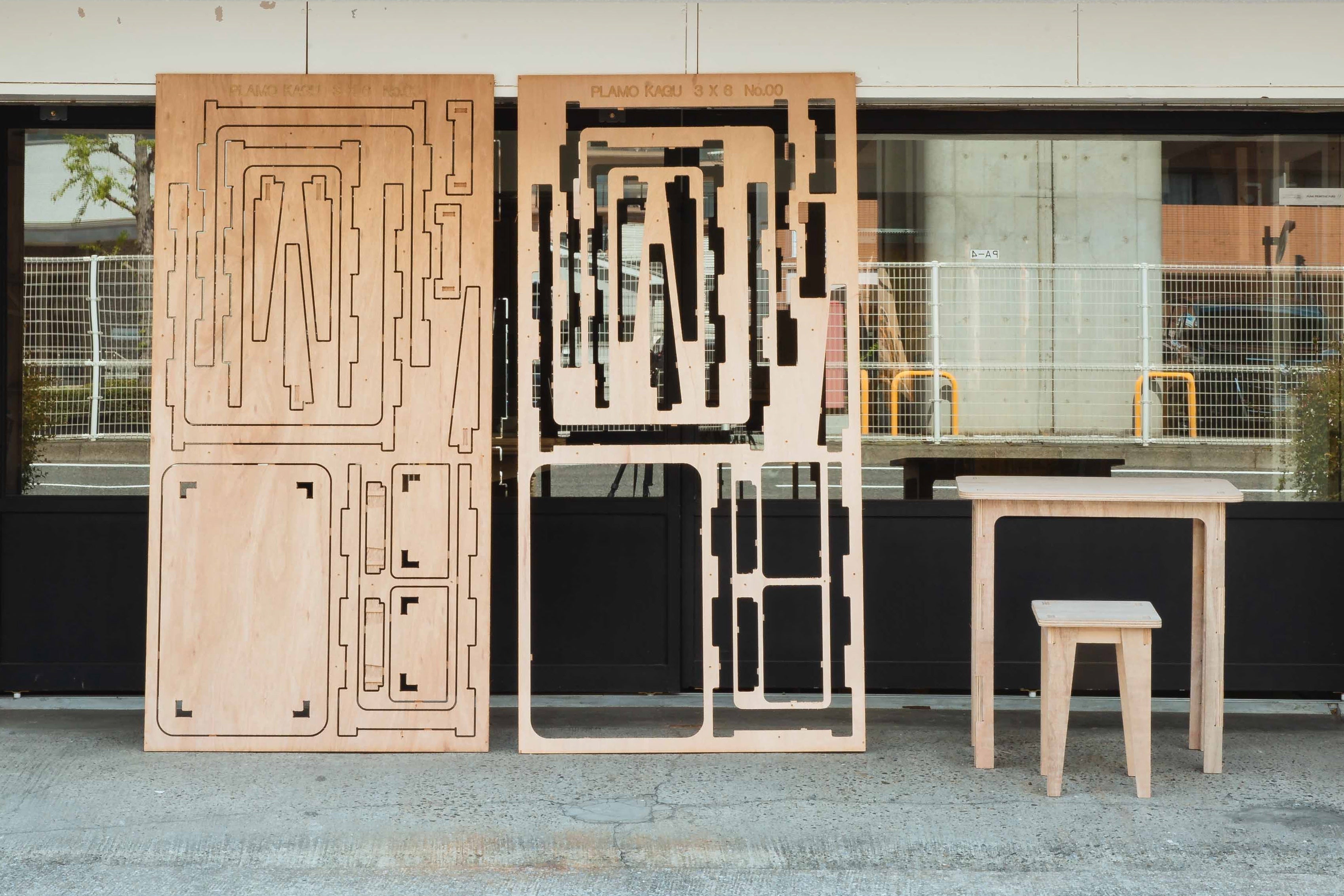 ▼これが「プラモ家具3×6(サブロク)」です。1枚の板からデスクとスツールができます。