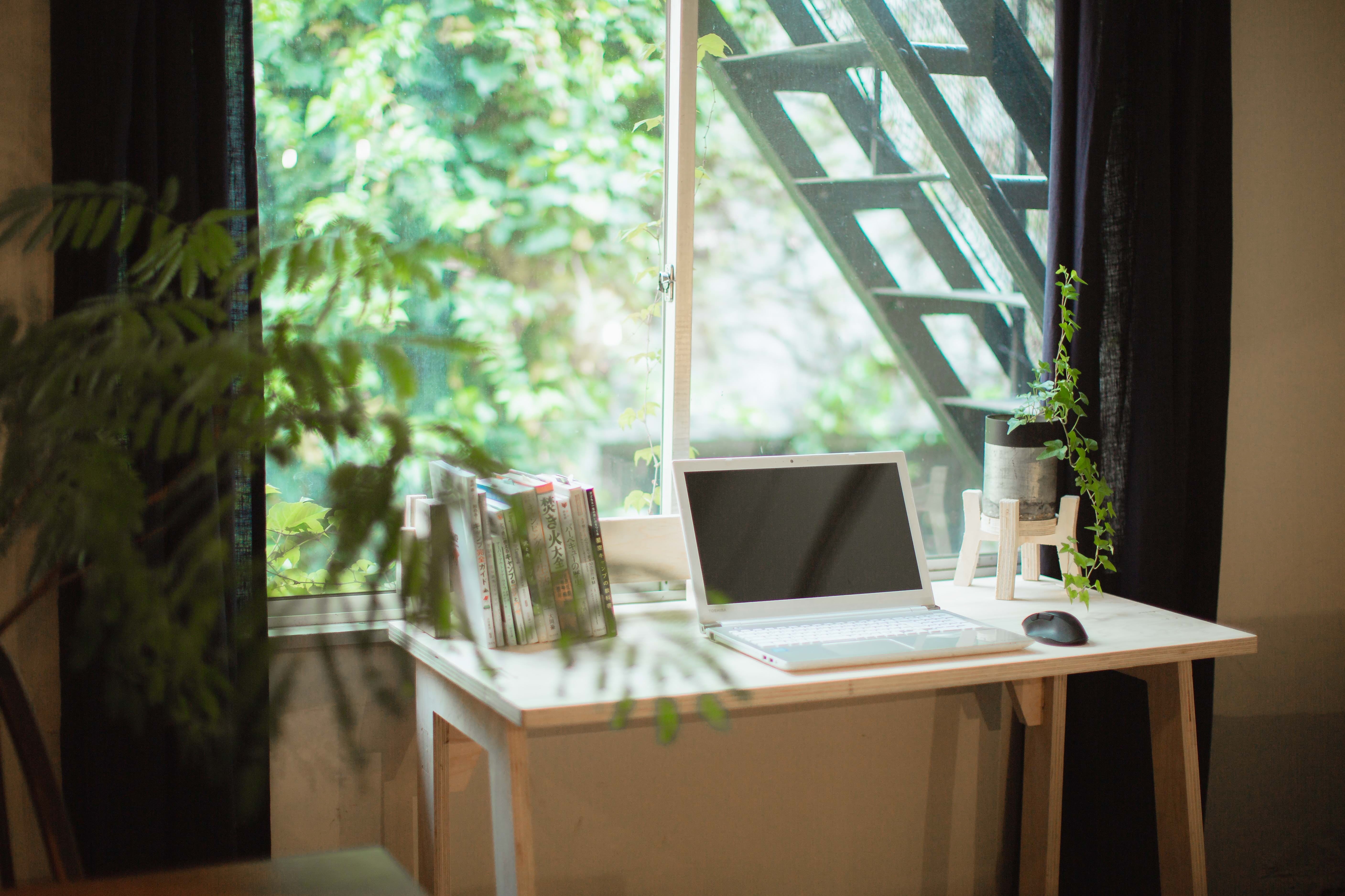 デスクとブックスタンドのセット。オフィスや、リモートワーク用のデスクにいかがでしょうか。ブックスタンドとスツールについてくるミニプランターベースを置いても〇。