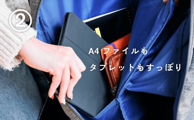 バッグの背中側にあるメインスペースはA4ファイルやタブレットといった小物もすっぽり収納できます。