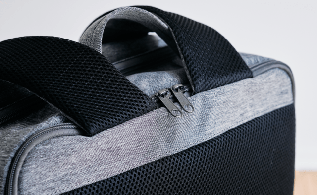 バッグの背中側にはパソコン(16インチまで)を収納できるスペースを設けています。メインスペースから独立しているため、他の荷物と干渉することはありません。