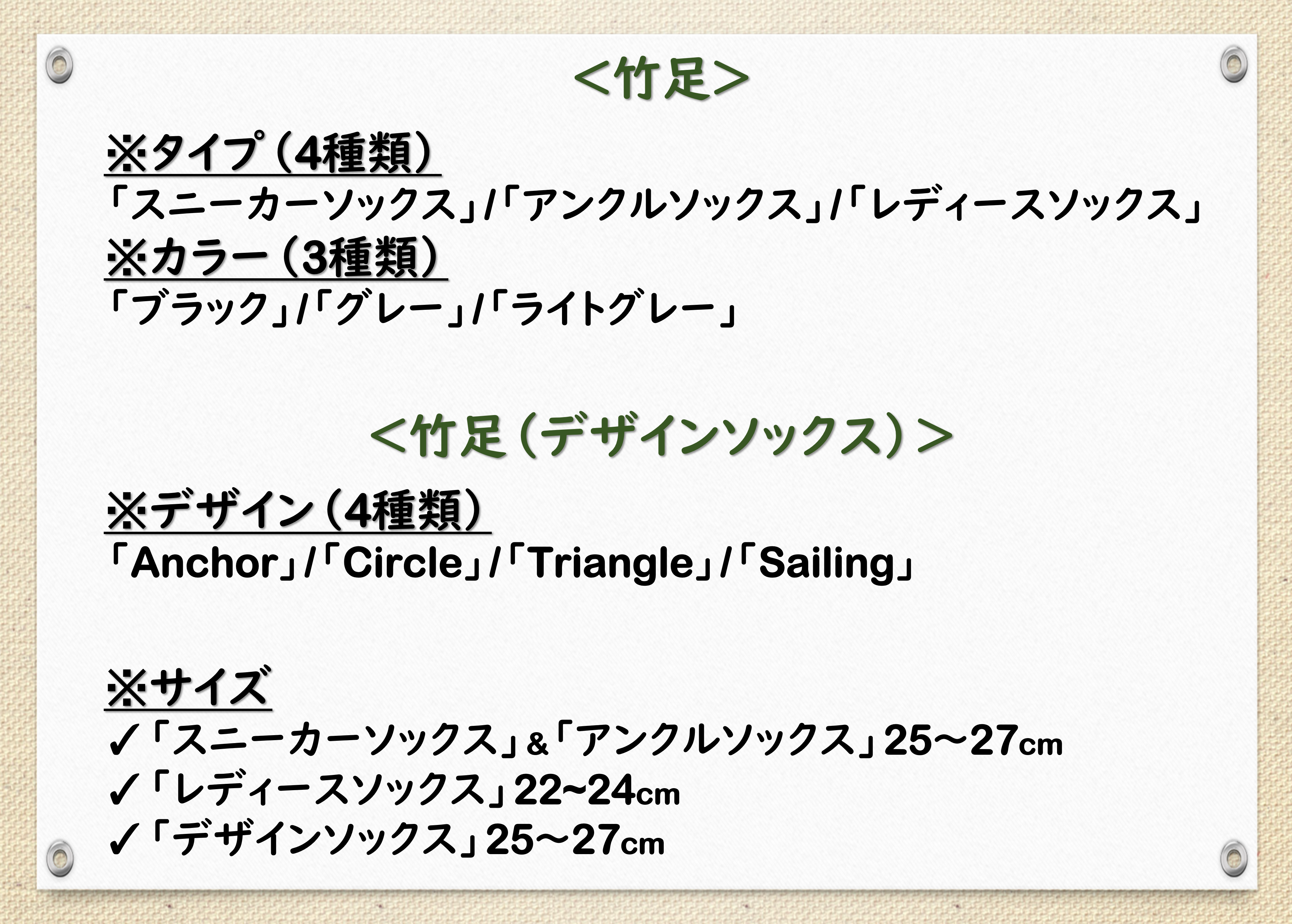 ⇒「スニーカーソックス」:25~27cm 、「アンクルソックス」:25~27cm 、「デザインソックス」:25~27cm、「レディースソックス」:22~24cmです。