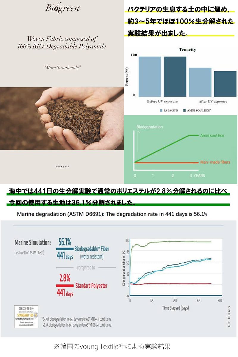 今回使用する生地は土で3~5年で100%生分解されることが分かり、海中では441日で36.1%生分解されることが分かりました。(海中だと最大90%以上は生分解されないです)