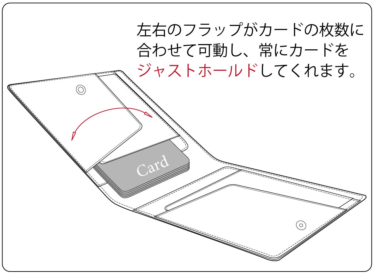 カードをホールドする2枚のフラップが可動する独自設計により、カードの枚数に左右される事なく常にカードをホールドします。<意匠登録第676247号>