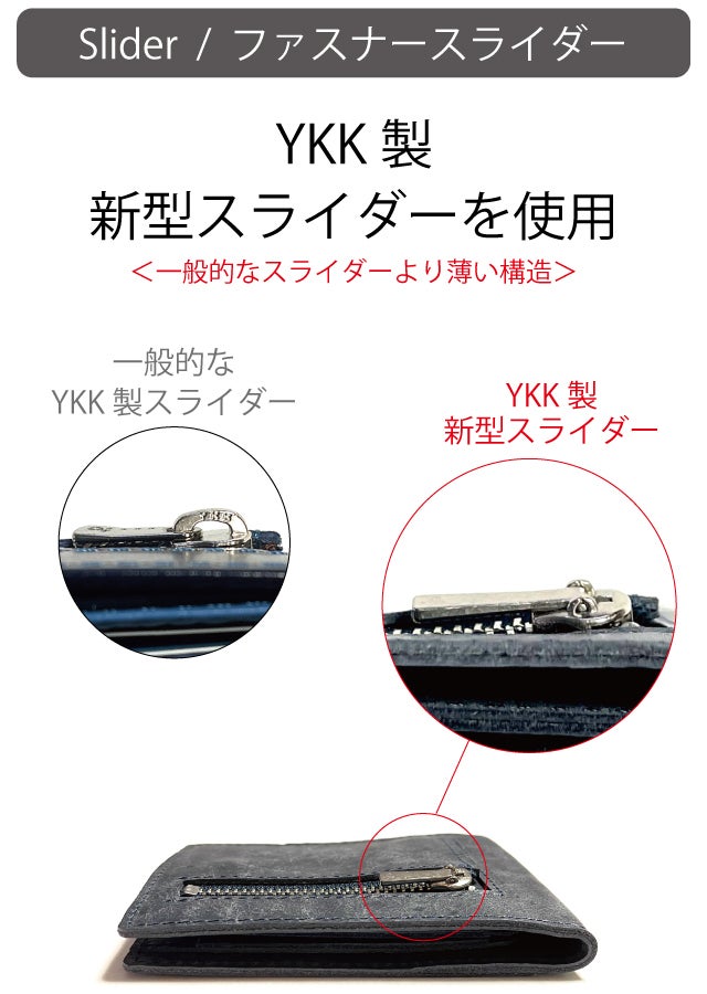 一般的なスライダーに比べて薄い構造のYKK新型スライダーを使用。フラットな位置でキープできるため、出し入れ時の「ひっかかり」を防ぎます。