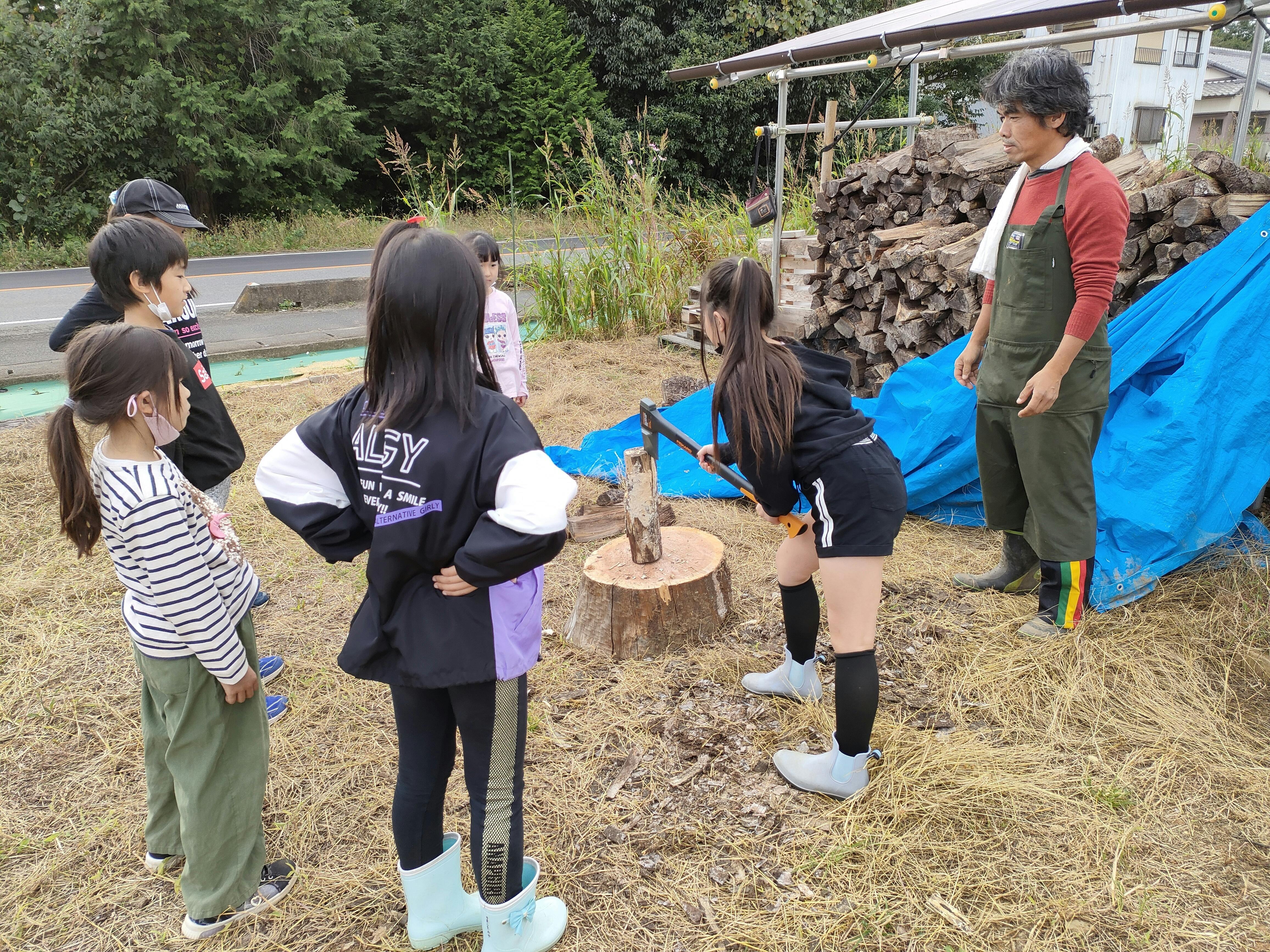 10時開始の全日プログラムでは、子どもたちが薪を割り、火を起こして、昼食作りもしています。