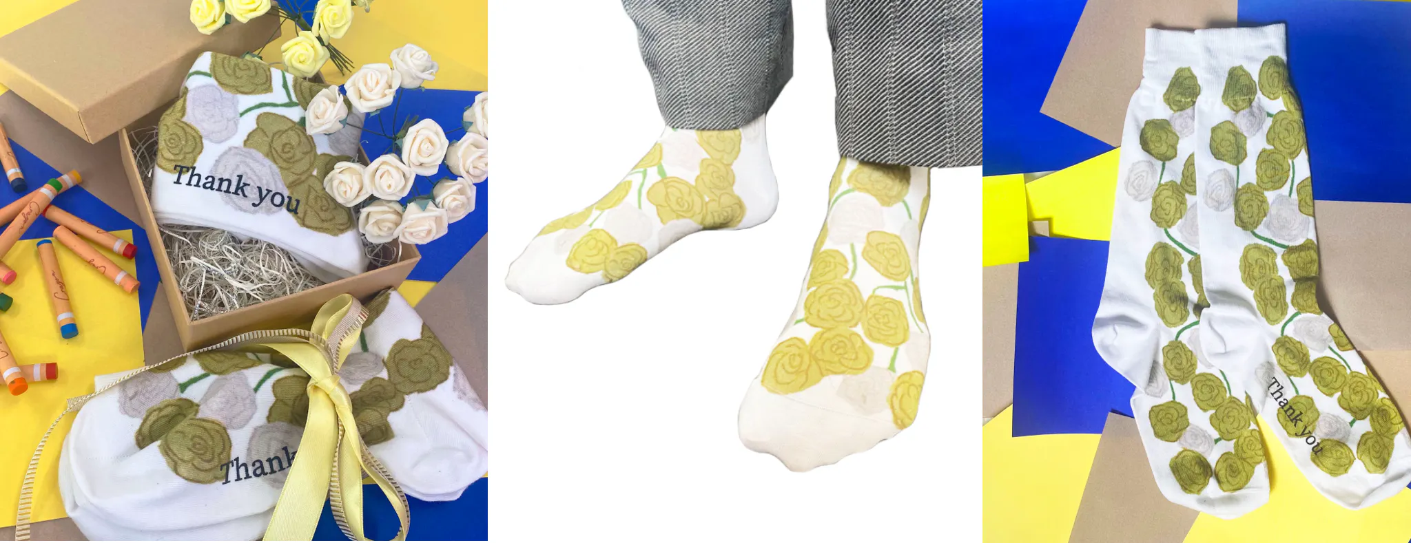 父の日によく贈られる黄色と白の薔薇をモチーフにしたデザイン。花言葉は ”尊敬” 。なんてことない日にもらったとしてもハッピーになれそうです。子供がクレヨンで描いたようなイメージを落ち着いたカラーで表現しました。ブランド名もさながら、カラーリングも足元に輝きを与えてくれる靴下となりました。大切な人のちょっとしたプレゼントにいかがでしょう。