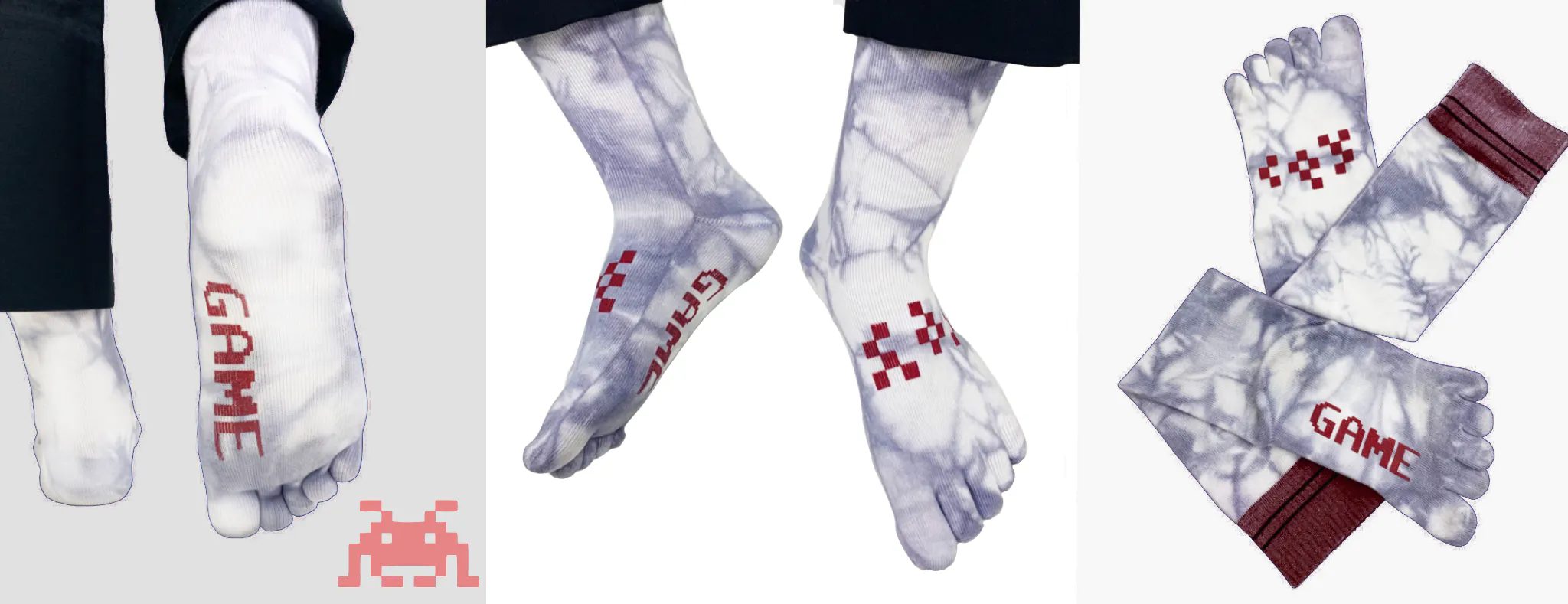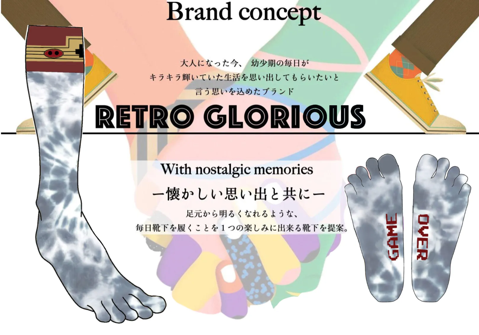 昔懐かしのゲームの世界をデザインに落とし込み、足裏には”GAME OVER”の文字が施されるなど遊び心のある靴下に仕上がりました。