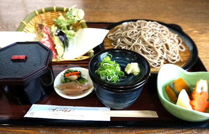 地元で栽培したそば粉のみを厳選し、つなぎを一切使わない十割そばにこだわった逸品が味わえます。四季折々の山菜を使った郷土料理や地元野菜、そばがきやそばカリントウ、冬にはかきもちも好評。また、本格的なそば打ち体験も行っています。