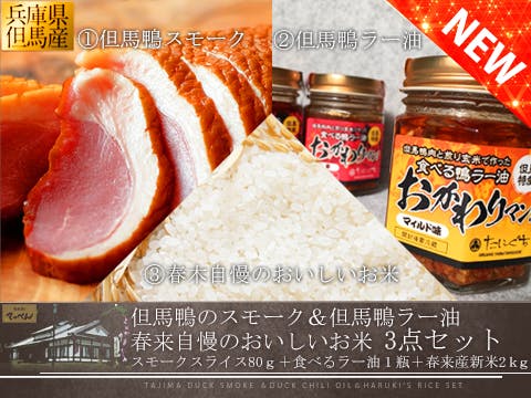 「春来自慢の美味しいお米」と「但馬鴨スモーク」と「食べる鴨ラー油」の3点セット
