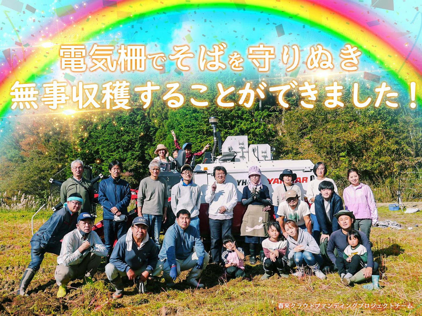 2021/11/09 21:29皆さまクラウドファンディング『獣害に苦しむ春来に収穫と喜びの笑顔を取り戻すための力を貸してください!』にご支援を頂き有難うございました!皆さまのご支援で、計3つの農地に電気柵を設置し、春来自慢のそばの栽培にチャレンジしていましたが、野生動物からそばを守りぬき、無事収穫することができました!~~お知らせ~~11/9(火)の神戸新聞で今回のクラウドファンディングの活動が紹介されました!11/10(水) サンテレビ17:00~放送の「NEWS×情報 キャッチ+」の番組内で放送予定です。だいたい17:30頃から放送されるようです。~~~~~~~~さて、設置した電気柵の周囲に設置していた自動撮影カメラの映像には、本当にたくさんのシカ・イノシシが、次から次へのひっきりなしに映っていました。ごく一部を動画にまとめましたので、ご覧ください。これは撮影された映像のごく一部です。本当にたくさんのシカ、シカ、シカ・・・、イノシシ、イノシシ・・・が出没していましたが、今回実証試験をした3つの農地ともまったく被害を受けることなく、改めて正しく電気柵を設置して、維持管理することの効果を証明できました。野生動物から守った後は・・・いよいよみんなで収穫の喜びを!収穫体験で都市部から駆けつけてくださった皆さんと一緒に喜びを分かち合いました!大人も子供も、最新のそば収穫用のコンバインに乗車させてもらい、収穫体験!さともん代表の鈴木も娘と収穫体験させてもらいました!そのほかにも、籾殻の薫炭で焼き芋をしたり蒔割りをしたり柿を収穫させてもらったり柿の木には最近出没したというクマの生々しい爪あとが・・・さまざまな野生動物と隣あわせの生活であることを実感しました。今回収穫したものではないですが、美味しいお蕎麦もいただきました!ぜひ新蕎麦を食べてみたくなりますね!この度、多くの皆さまに支えられて、今回のプロジェクトが成功したことを本当にうれしく思います。私も、こんなにも多くの皆さんの支援を受けながら「設置した電気柵が突破されて被害を受けてしまったらどうしよう・・・」と気が気でありませんでしたが、どんなに周囲に野生動物がいても、正しい設置と管理を徹底することで、農地は守れることを実証できて、本当に良かったと思います。電気柵は多くの皆さんが使用している技術です。この成果を活かして、正しい知識や技術をもっともっと普及して、春来集落の他の農地や春来以外の他の集落を獣害から守ることに活かしていければと思います。区長はじめ、春来区の皆さんも大変喜んでくれました。改めて、皆さまの御礼申し上げます。今後は電気柵の効果を最大限に活かすために、積雪に備えた撤去や融雪後の設置タイミングを検討していきます。撤去しやすい設置の工夫なども検証していく予定です。最後にクラウドファンディングの成功を祝して、記念撮影! もっと見る