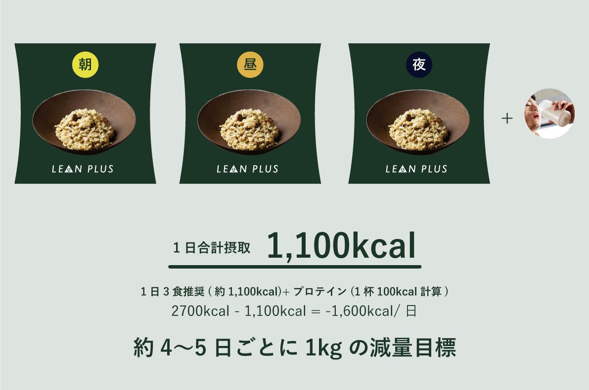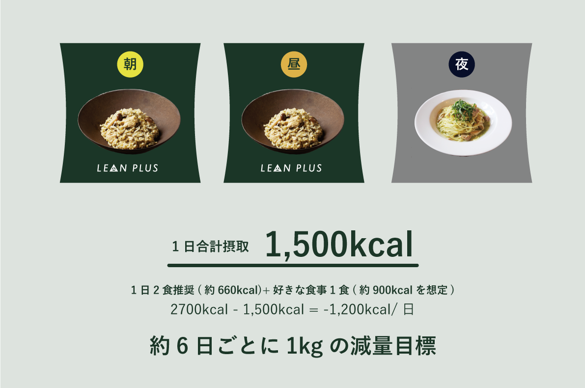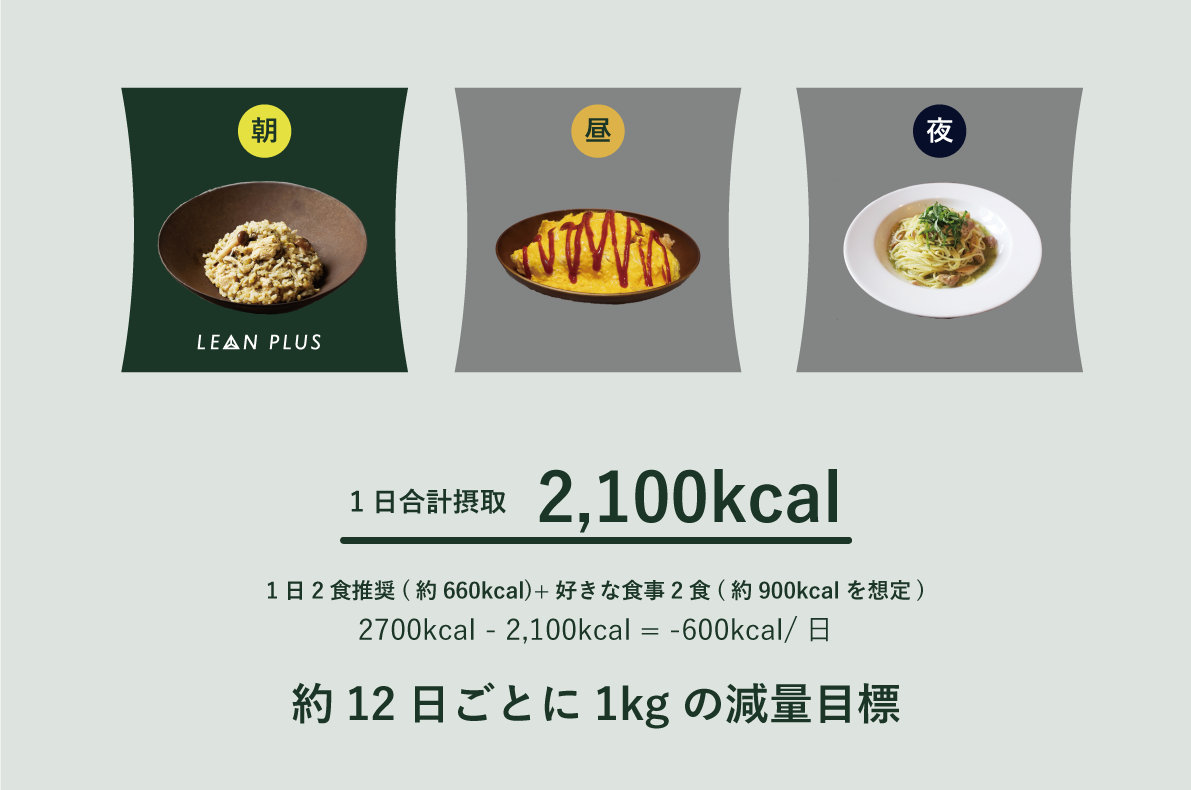 『日本人の食事摂取基準』の2020年版で定められた30〜49歳の一般男性の推定エネルギー必要量2700kcal(活動レベルⅡ)を元に、『LEAN PLUS』を導入した際のイメージを用意しました。