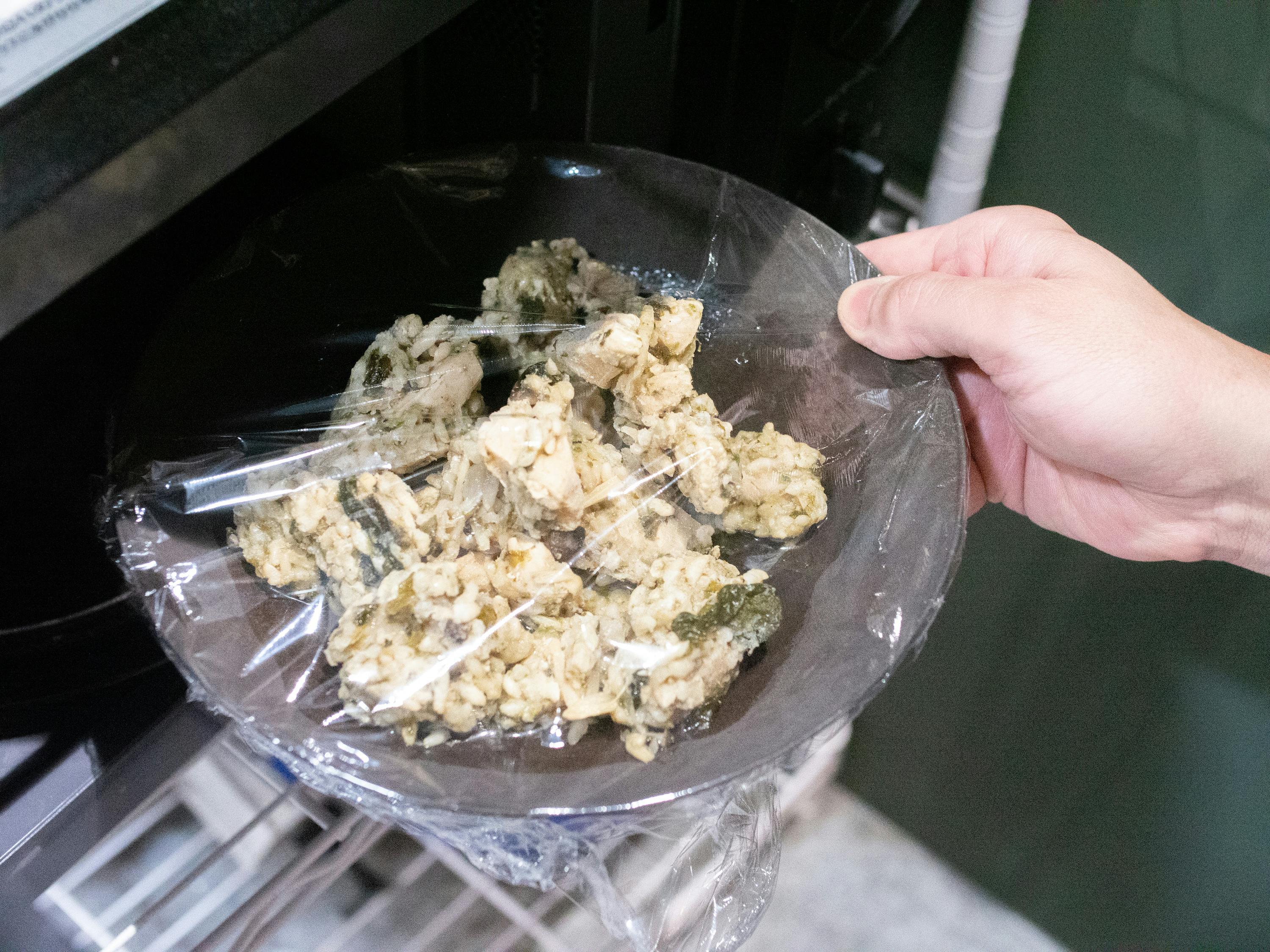 冷凍庫から出して、水を入れ、レンジで6分温めるだけのリゾット風の食べ物です。