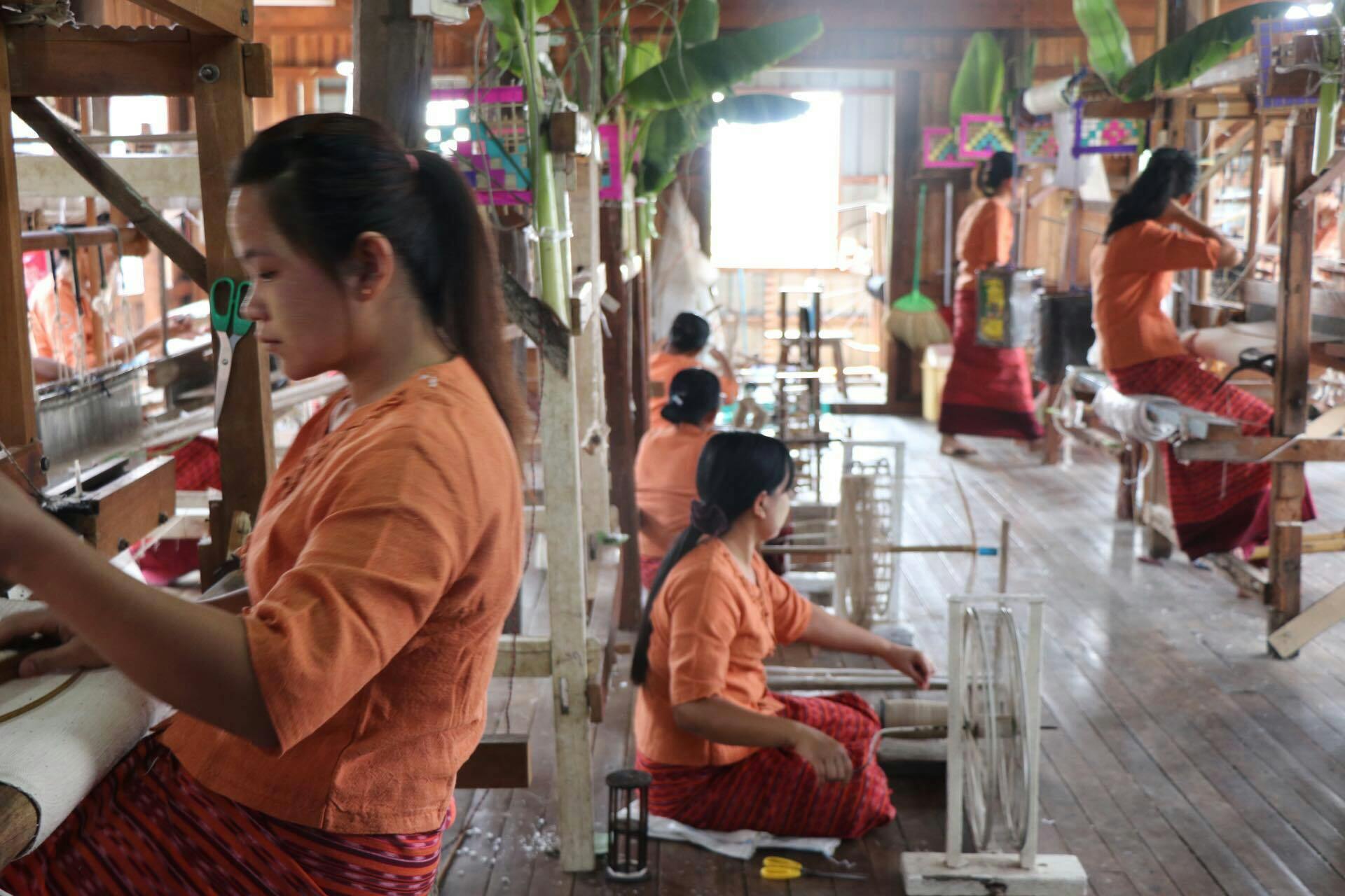 インレー湖畔の小さな工房では、地元の人たちが蓮の栽培から布織まで