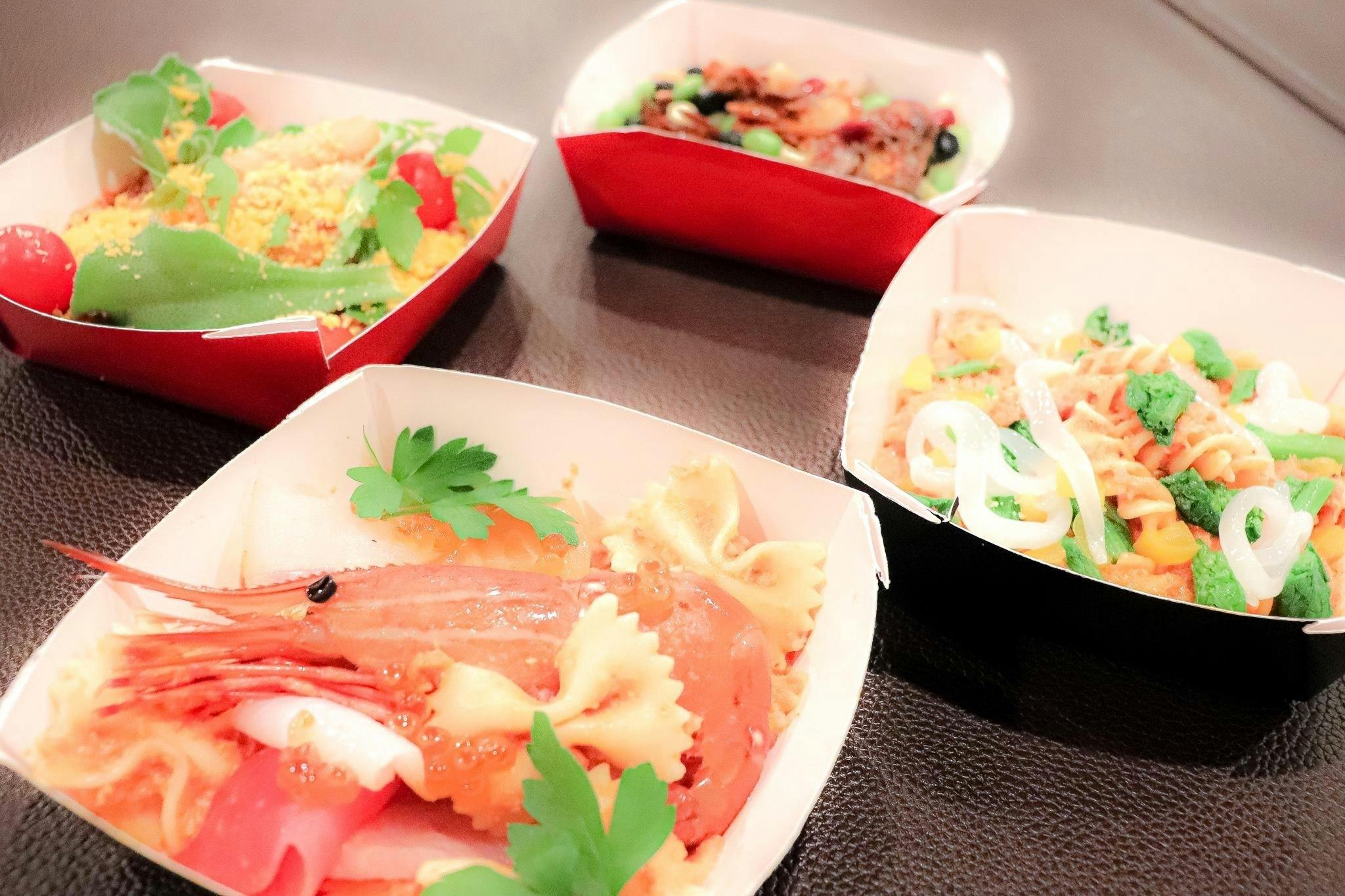 4種類セットはすべての味を楽しめるセットになっていて、『ソフトシェルクラブとヘルシー彩り豆の3色ペンネ』、『生のボタン海老を添えた海老のボロネーゼ』、『イノシシ肉のラグーソースパスタ』、『渡り蟹ソースのフジッリ』の4種類です。