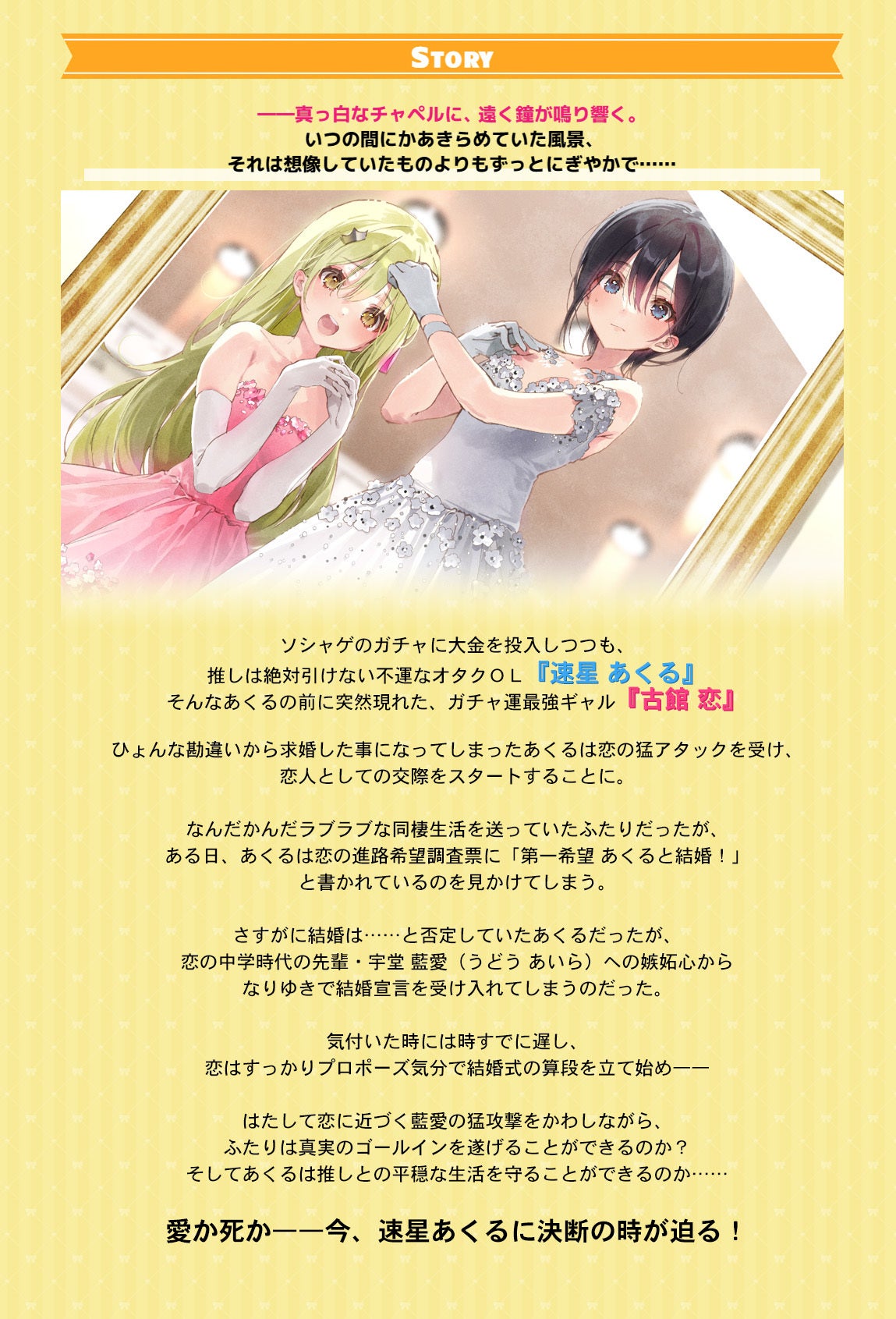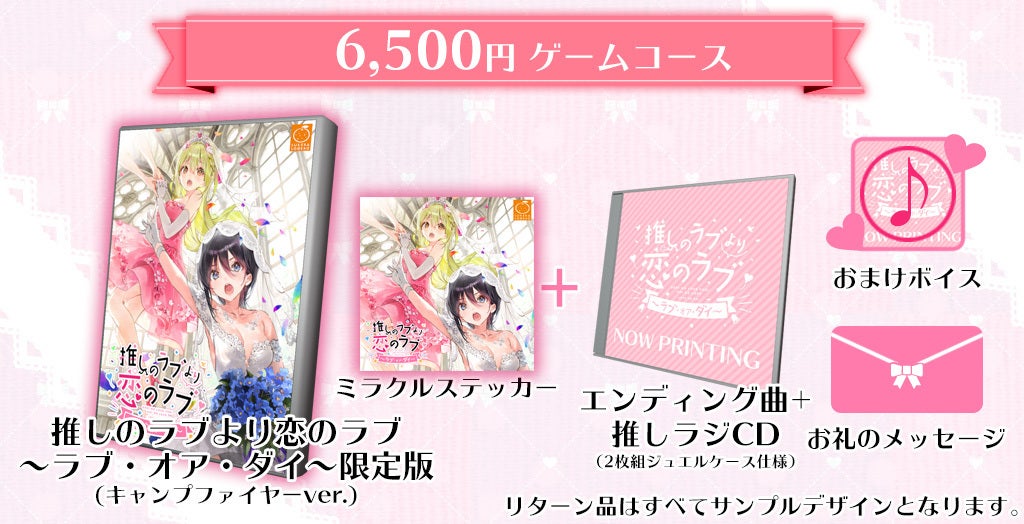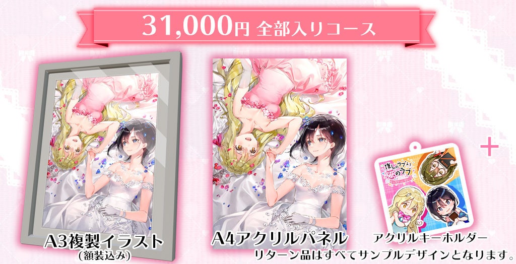 2022/07/31 13:30本日、7月31日(日)18時から始まる。『推しのラブより恋のラブ』の新作ボイスドラマクラウドファンディングプロジェクトのリターン品の紹介です!まずは3,000円コースのCDについてです。CDには新作ボイスドラマが2本収録されております。あくると恋がメインのストーリー「推しのラブより恋のラブ 半年遅れのマリッジリング」志乃と藍愛がメインのストーリー「推しのラブより恋のラブ 大変身!?志乃のお見合い大作戦」CDは一般販売もされますがクラウドファンディングにはそれに加え翻訳ムービーのDLキー(DLキーはSteamを利用予定)と収録後の熱をそのまま伝えるおまけボイスが支援者限定で付いてきます!非常にお得な機会なので是非、お見逃しなく!そして7,000円コースのアクリルパネルです。このボイスドラマのためにDSマイルさんに描き下ろしていただいたメインビジュアルの全体像がプリントされております。こちらも今回のクラウドファンディングでしか手に入らない逸品です!そして23,000円コースの複製イラストです。実は『推しのラブより恋のラブ~ラブ・オア・ダイ~』のメインビジュアルの候補ラフの一枚でした。 複製イラストの制作は50年以上の実績を誇る老舗製版会社の高精細プリントの技術を使用しておりますので間違いない仕上がりになっております。そして最後に推しラブまとめセットのご紹介です。実は推しラブをプレイしたことがない。友達にも紹介したい!百合の輪を広げたい!!方にピッタリなコースです。過去タイトルPCゲーム「推しのラブより恋のラブ」PCゲーム「推しのラブより恋のラブ~ラブ・オア・ダイ~」ボイスドラマ「推しのラブより恋のラブ あくると恋の交換日記」(ムービー仕様)のSteam DLキーをセットにしてお求めやすい価格でご提供します。以上がリターン品の紹介になります。本日、18時からのクラウドファンディングに是非、ご支援いただければと思います。皆さんも一緒に世界に百合を溢れさせましょう! もっと見る