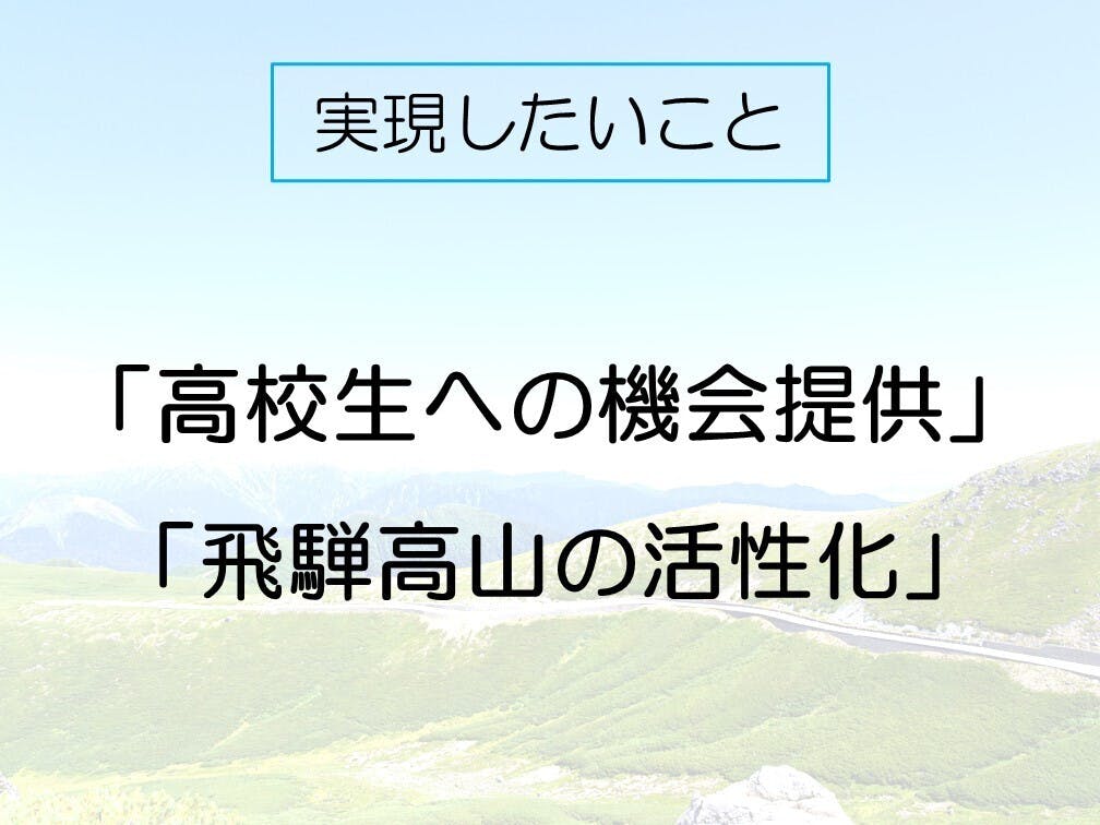 1つ目は、「高校生への機会提供」です。高校生はコロナの影響で得るはずだった様々な機会を失いました。文化祭をはじめとする行事、部活動の大会、学校での日常生活…。これらを実現できる機会を提供するのが、本企画の最も重要なミッションです。それに加えてもう一つ高校生に提供したいのは、大学生や社会人との交流機会です。私たちの地元「飛騨」はいわゆる”地方”であり、高校生が大学生や社会人と交流する機会は殆どありません。この企画を、より深く自分の人生について考える機会にしてほしいと考えています。